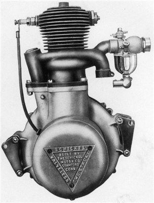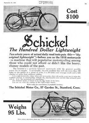 Schickel's vision and designs were evident in the two-cycle motorcycles that he developed. He also helped popularize the twist grip control, and had a patented "spring fork front suspension" and "fly wheel magneto."
