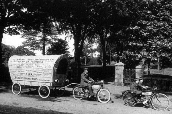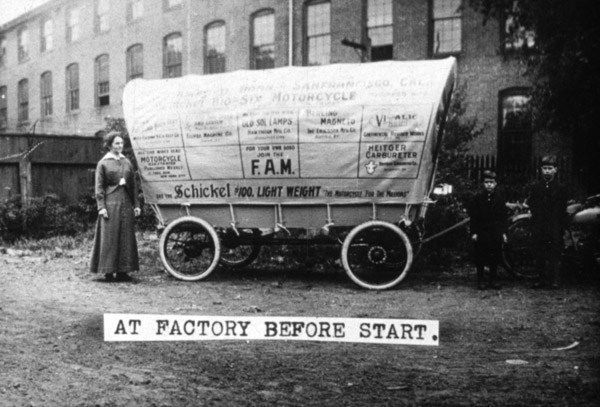 To try to boost sales, Schickel hired rider Maurice Gale and his family to advertise the Schickel line with a cross-country trip from Stamford, pulling a 2,145-pound covered wagon with a Schickel Big 6. The Gale family and the covered wagon attracted crowds, but he had to abandon the effort 1,514 miles into the trip—in Des Moines, Iowa—because rains made many dirt roads impossible to navigate.