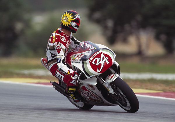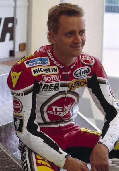 Kevin Schwantz came out of Texas and quickly rocketed to prominence as one of America’s best road racers during the mid-1980s. By the late 1980s, Schwantz moved to international competition in the 500cc Grand Prix World Championships. He was a perennial top rider in that series and won the world championship in 1993. During his Grand Prix racing career, Schwantz racked up 25 career 500cc GP victories, putting him second all-time among American riders.