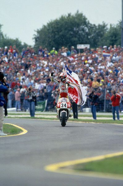 Schwantz went on to become one of the most successful Grand Prix riders of his era. His archrival throughout, as it had been at home in the United States, was Wayne Rainey. Schwantz won 25 GPs, placing him second to Eddie Lawson among American 500cc GP winners. The culmination of Schwantz’ career came in 1993 when he won the world championship. He was the last in the long line of U.S. riders who dominated 500cc Grand Prix from the late 1970s to the early 1990s, following in the footsteps of Kenny Roberts, Freddie Spencer, Eddie Lawson, and Rainey. Schwantz won his last Grand Prix in Great Britain in 1994.