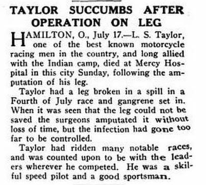 Then, tragedy. During a dirt track race on July 4, 1916, in Hamilton, Ohio, Taylor and Harley rider Maldwyn Jones collided. Taylor suffered compound leg fracture. Infection set in, and doctors tried to save Taylor’s life by amputating his leg, but it was too late.