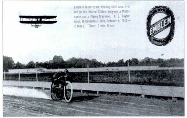 Taylor rose to fame in 1910 by racing a “flying machine” on the mile dirt track of Columbus Driving Park in Columbus, Ohio. Taylor and his Emblem beat the airplane, a Wright Model B, flying above. Emblem used the feat of Taylor’s victory over the plane as a major part of its public relations and advertising materials.