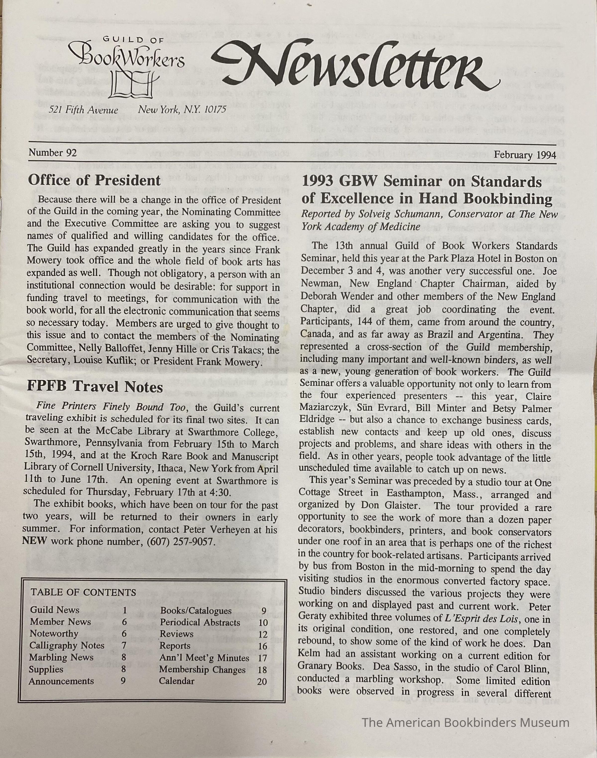 Guild of Book Workers Newsletter ; No. 92 , February 1994Entry/Object ID