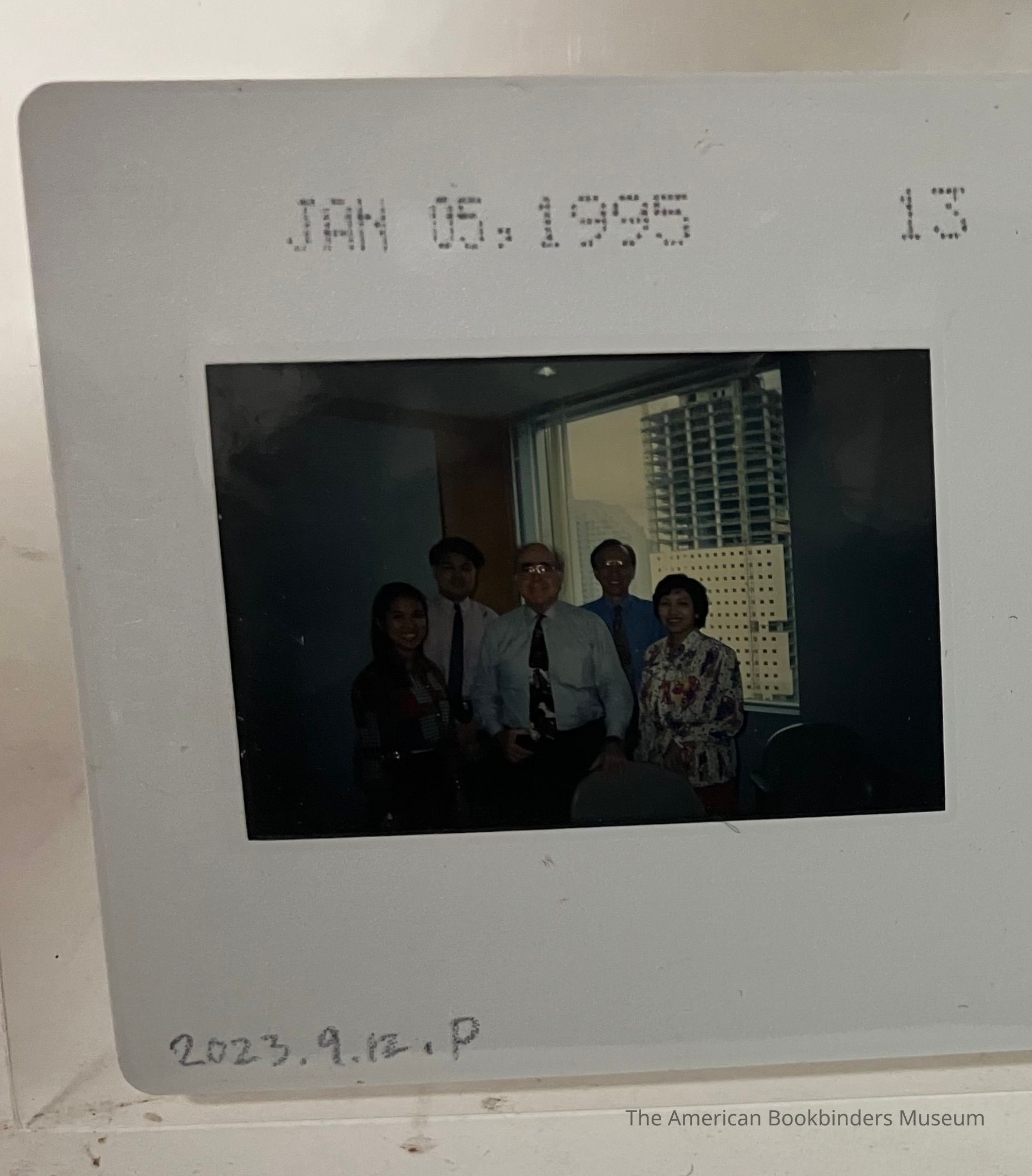 Slide showing five figures, two women and three men. One woman and man is also shown 2023.9.12.o. Behind the group is a window showing a skyscraper under construction.Collection