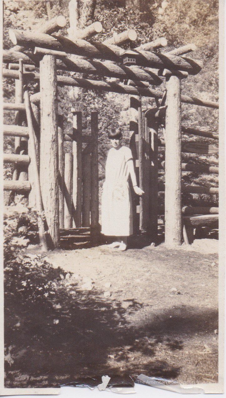 Photo of a young woman, possibly Stella Patri, standing in a doorway made of cut logs.