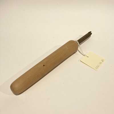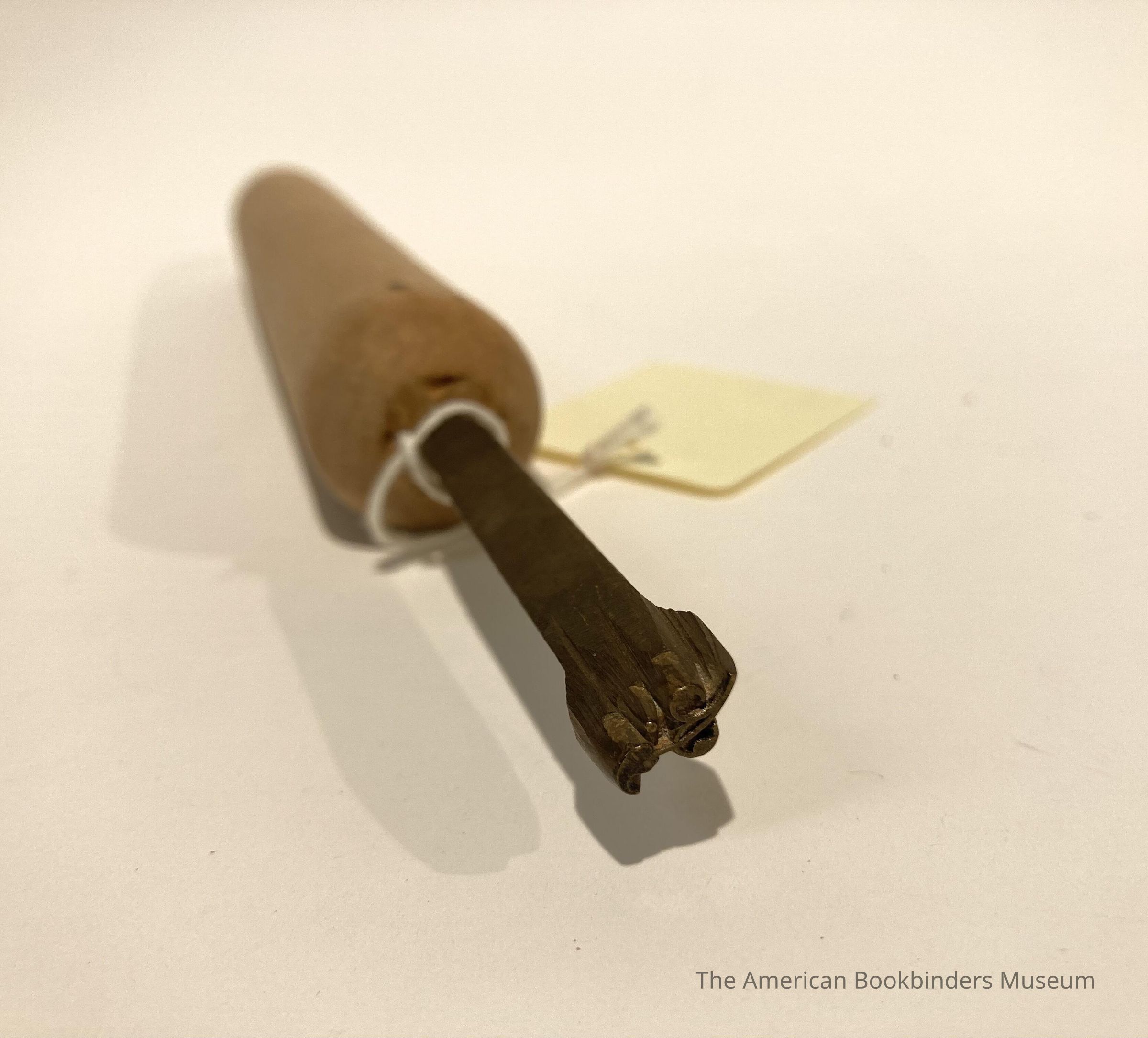 Hand stamp with wood handle. Small, 1cm design of flower bud on straight upright stem, two small curling leaves branching asymmetrically.