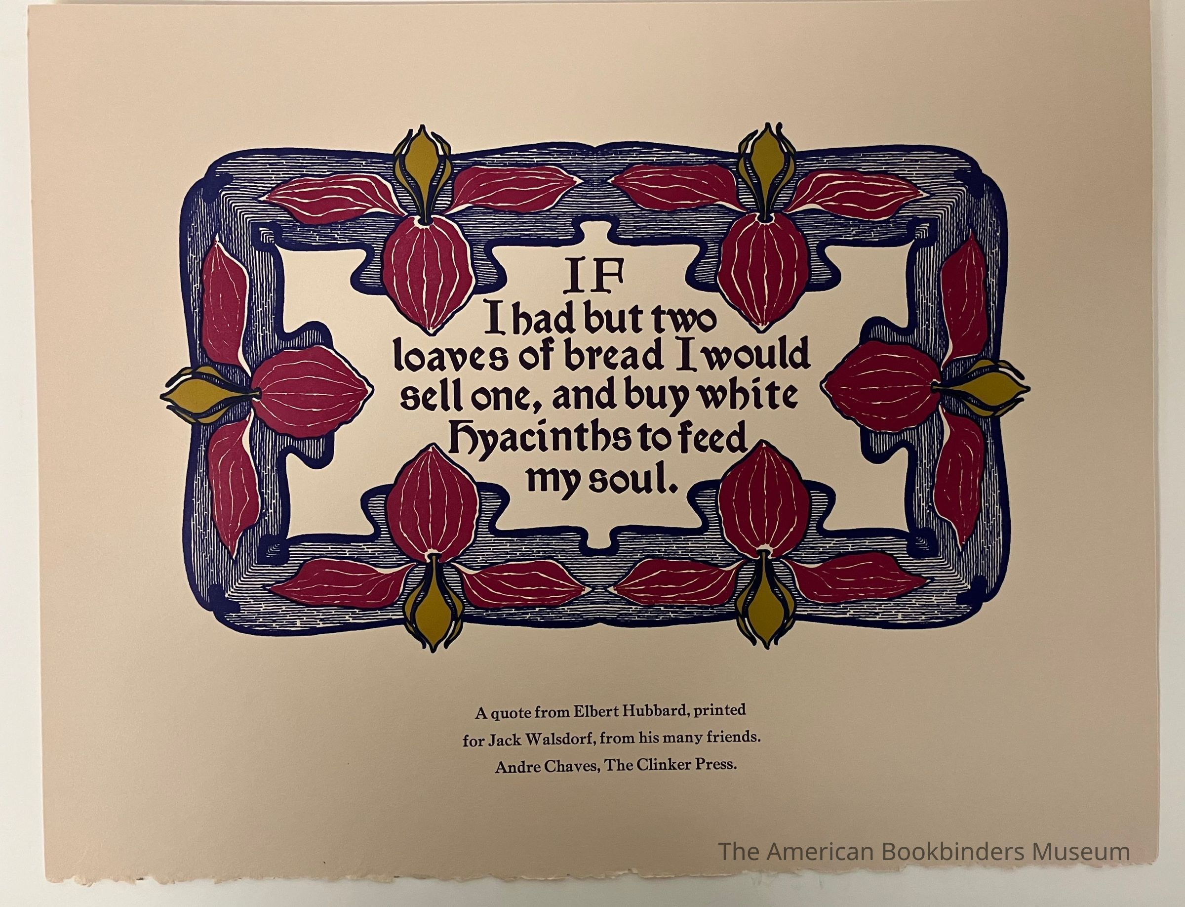 Cream paper. A frame of a blue outline and flowers of magenta and green. Quote in the middle in dark gray. Context and printer below. Bottom edge is raw.Collection