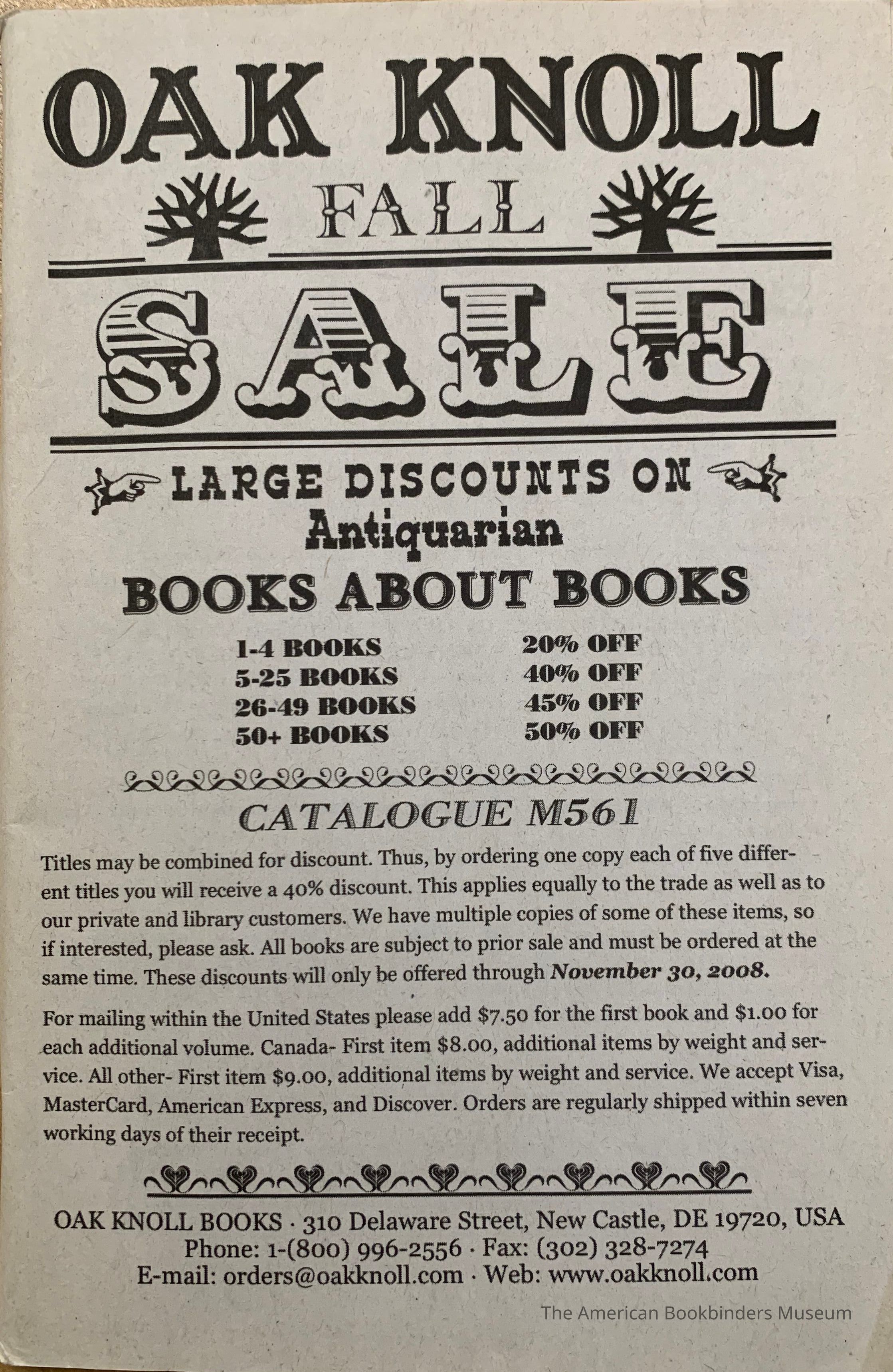 Oak Knoll fall sale, ... Antiquarian books about books. Catalogue M561.