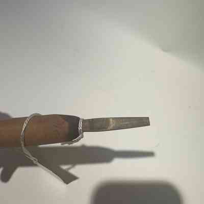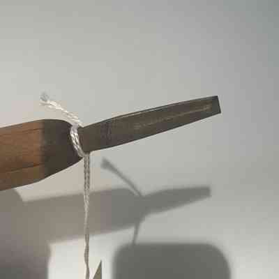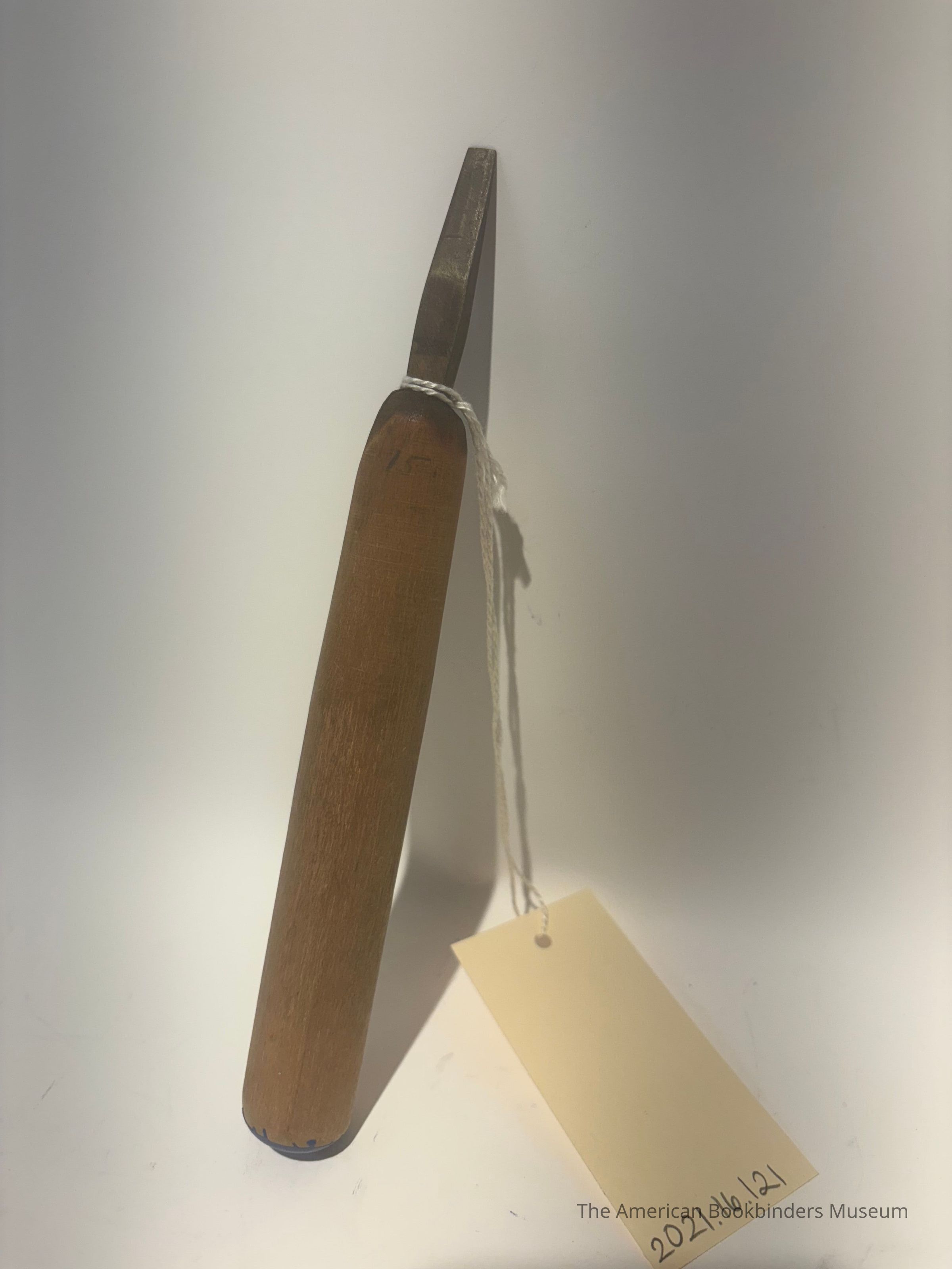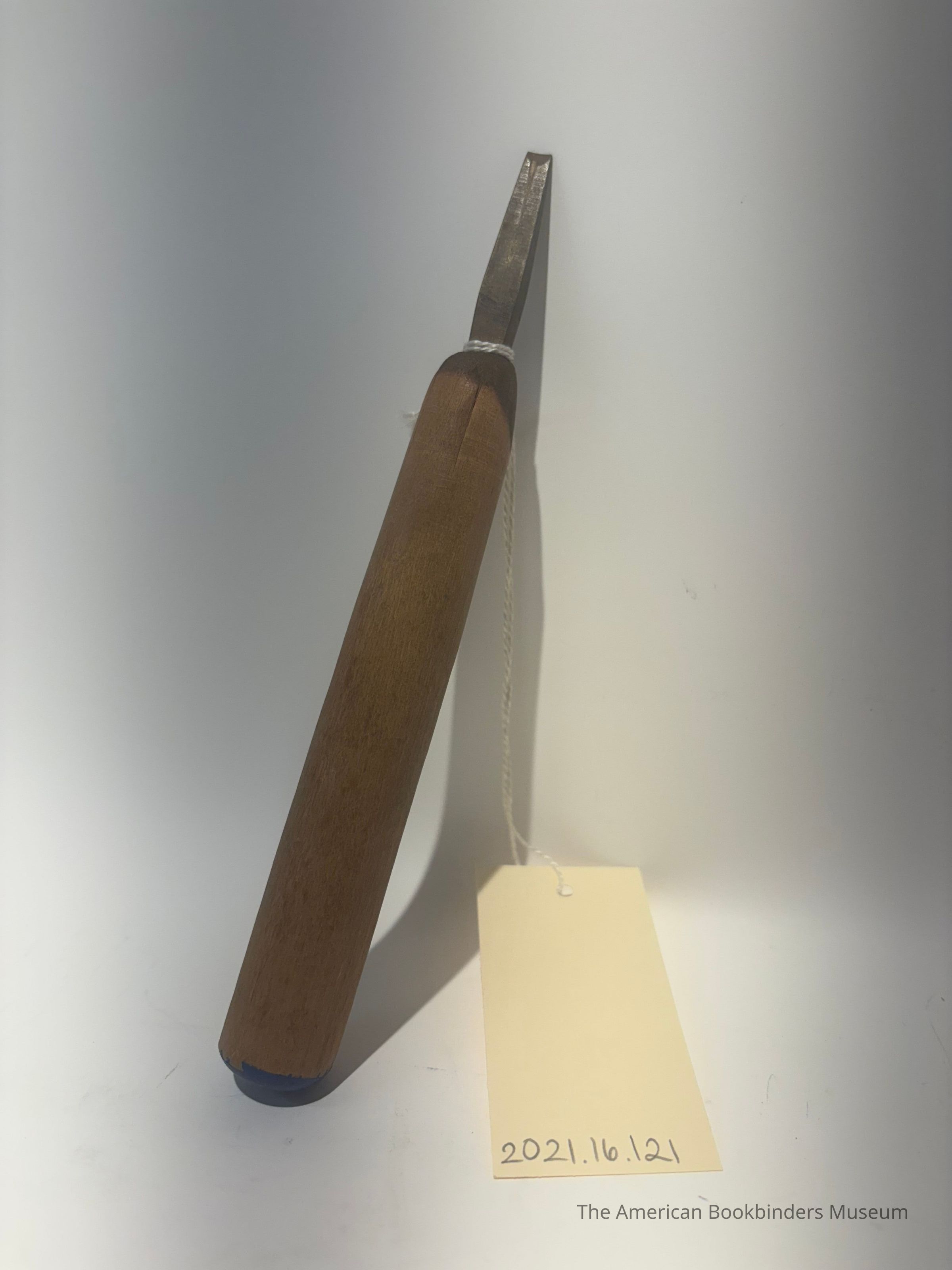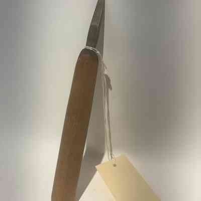 Small metal gouge hand tool with wooden handle. The end of the handle is painted blue.