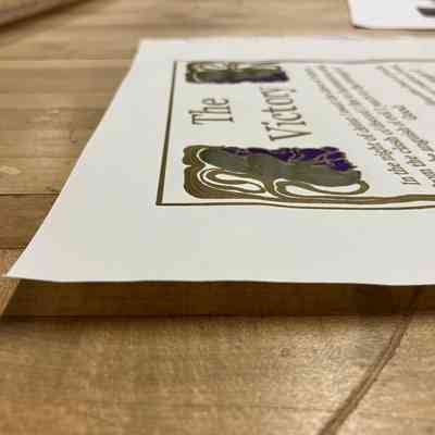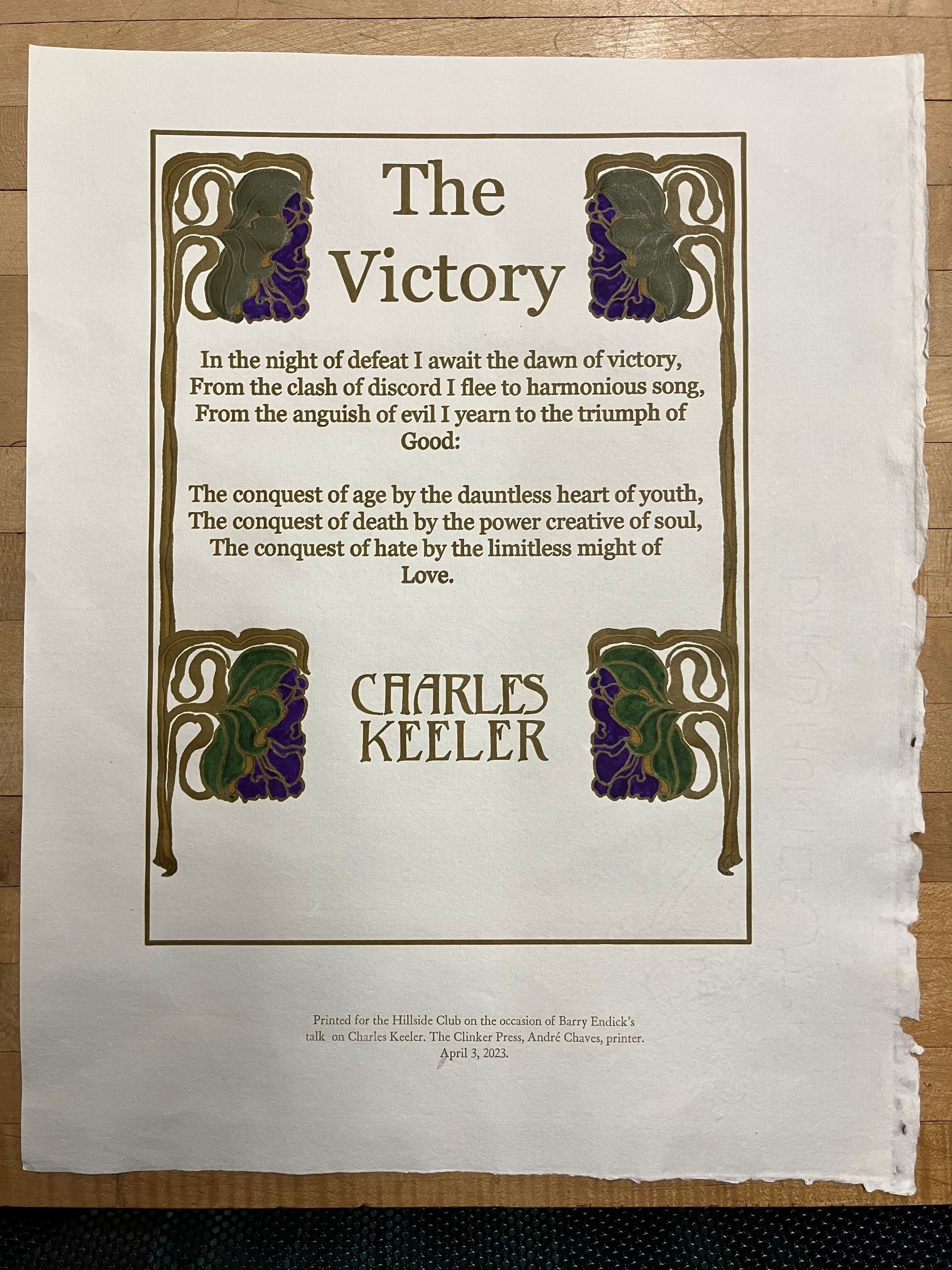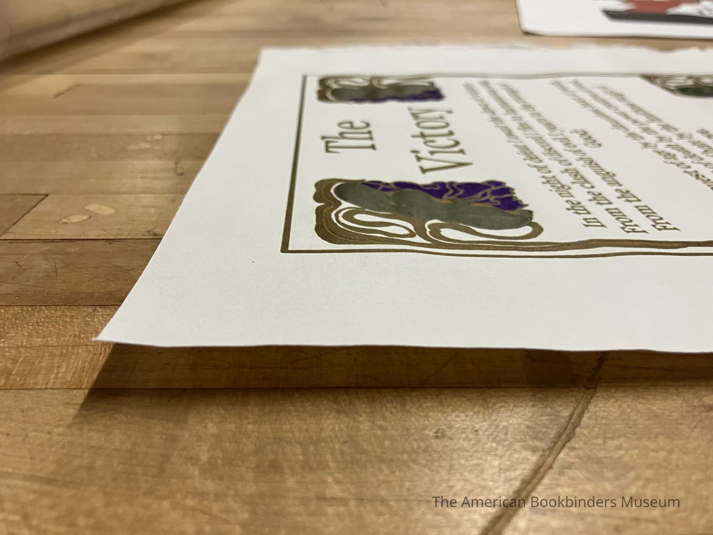 Purple, dull green, and light brown ink. Two purple flowers in the top corners, two frame the author. The Lowe flowers have had green ink applied to the leaves. Title frames by the top two flowers, with text below in dull green. Context and printing information below. Thin paper with raw right and bottom edges.Collection