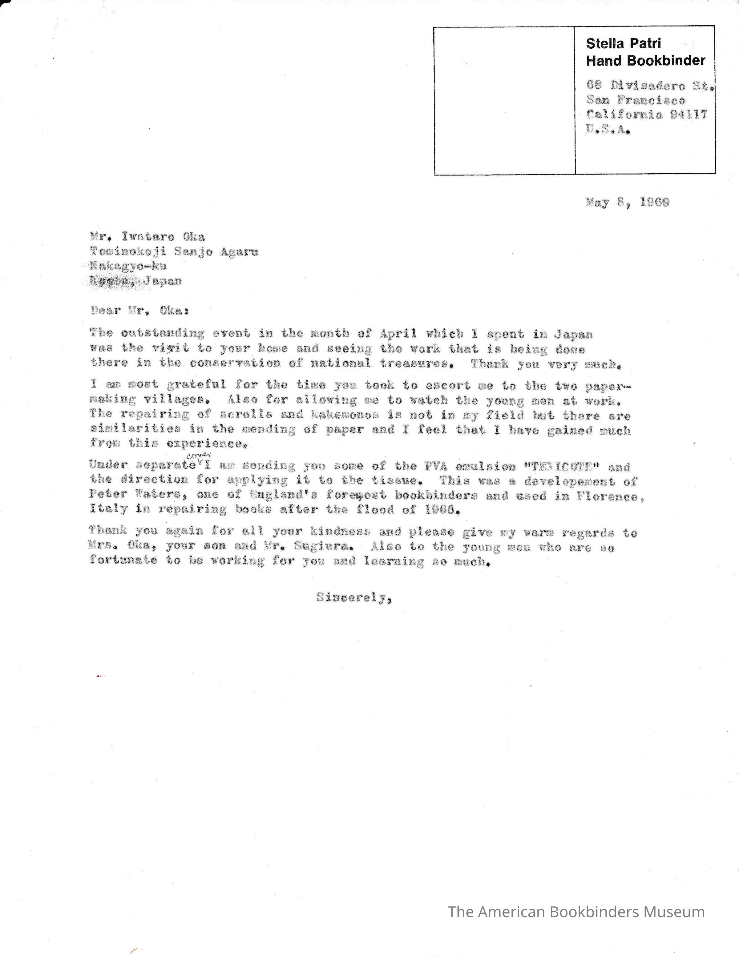 A letter of thanks from Patri for Oka's hospitality, as well as showing the conservation work being done on the scrolls and kakeomonos.Collection