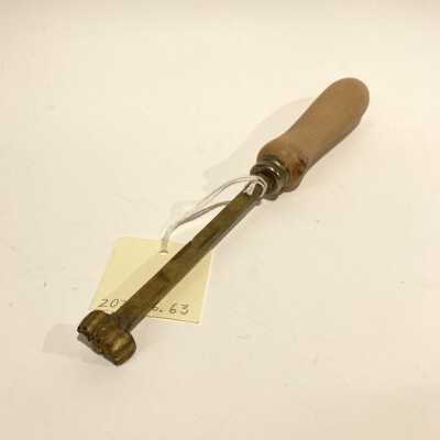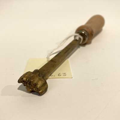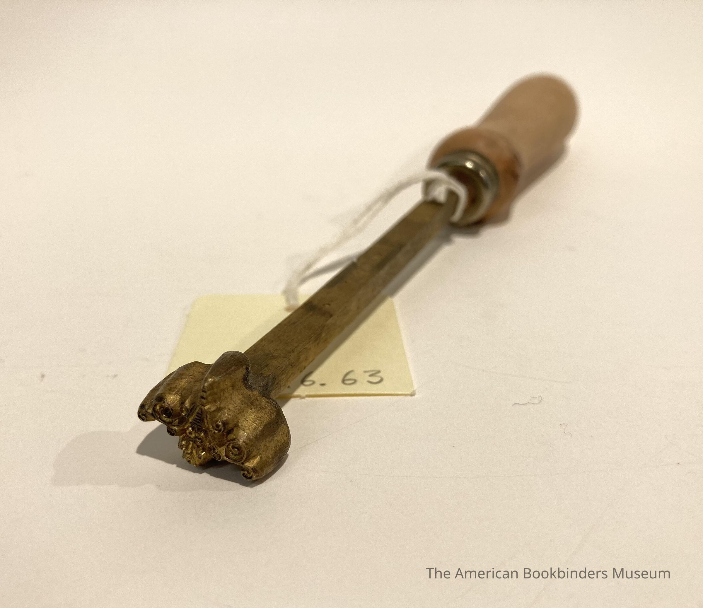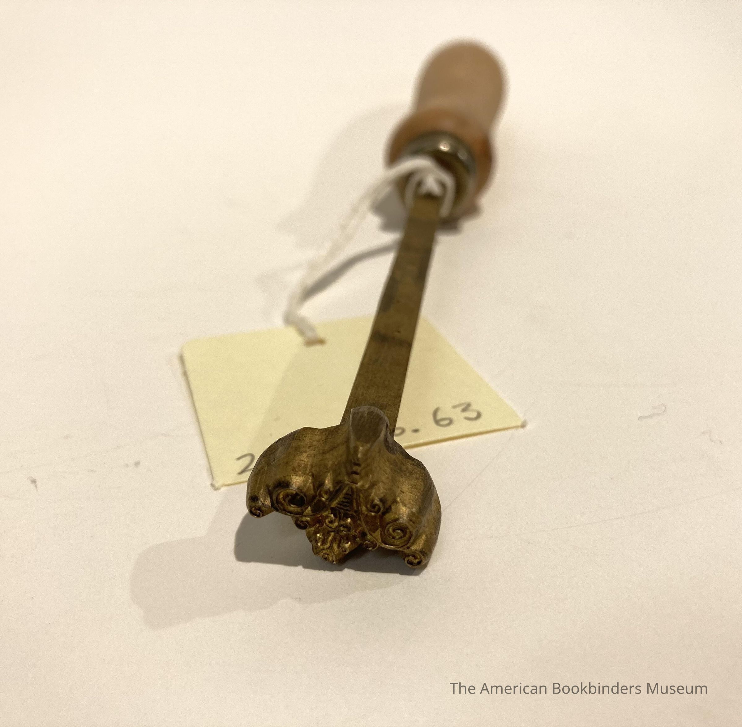 Hand stamp with wood handle. 2cm filigree design with 2 fractal swirls branching from the center, vertical line of smaller swirls.