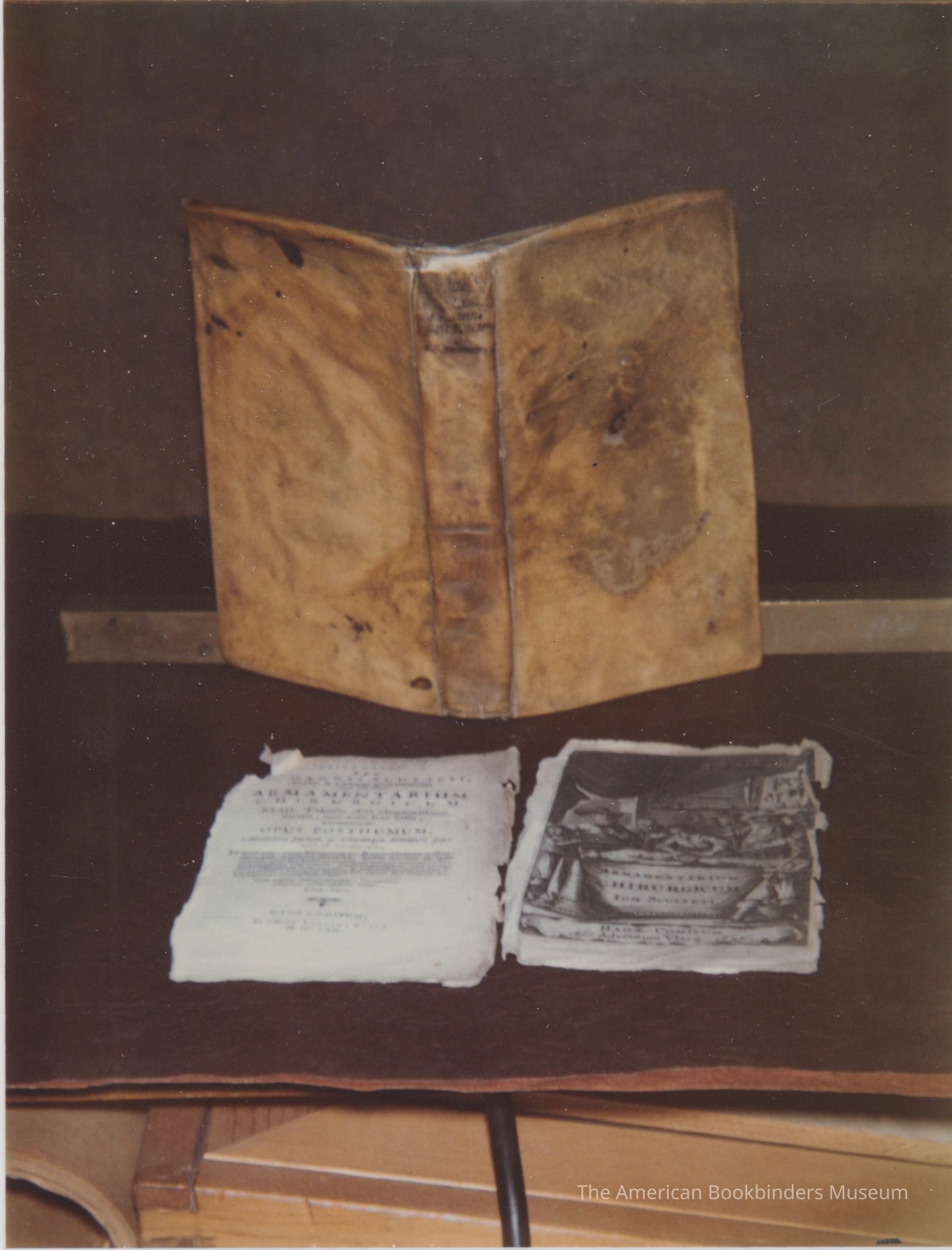 Photo shows a book being supported by a metal bar. The cover shows warping. In front of the book is the title page, with 'Armamentarium' visible and readable. A print from the book is next to the title page, showing figures at a table. The same materials appear in 2023.9.11.cf.Collection