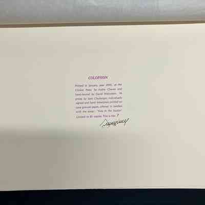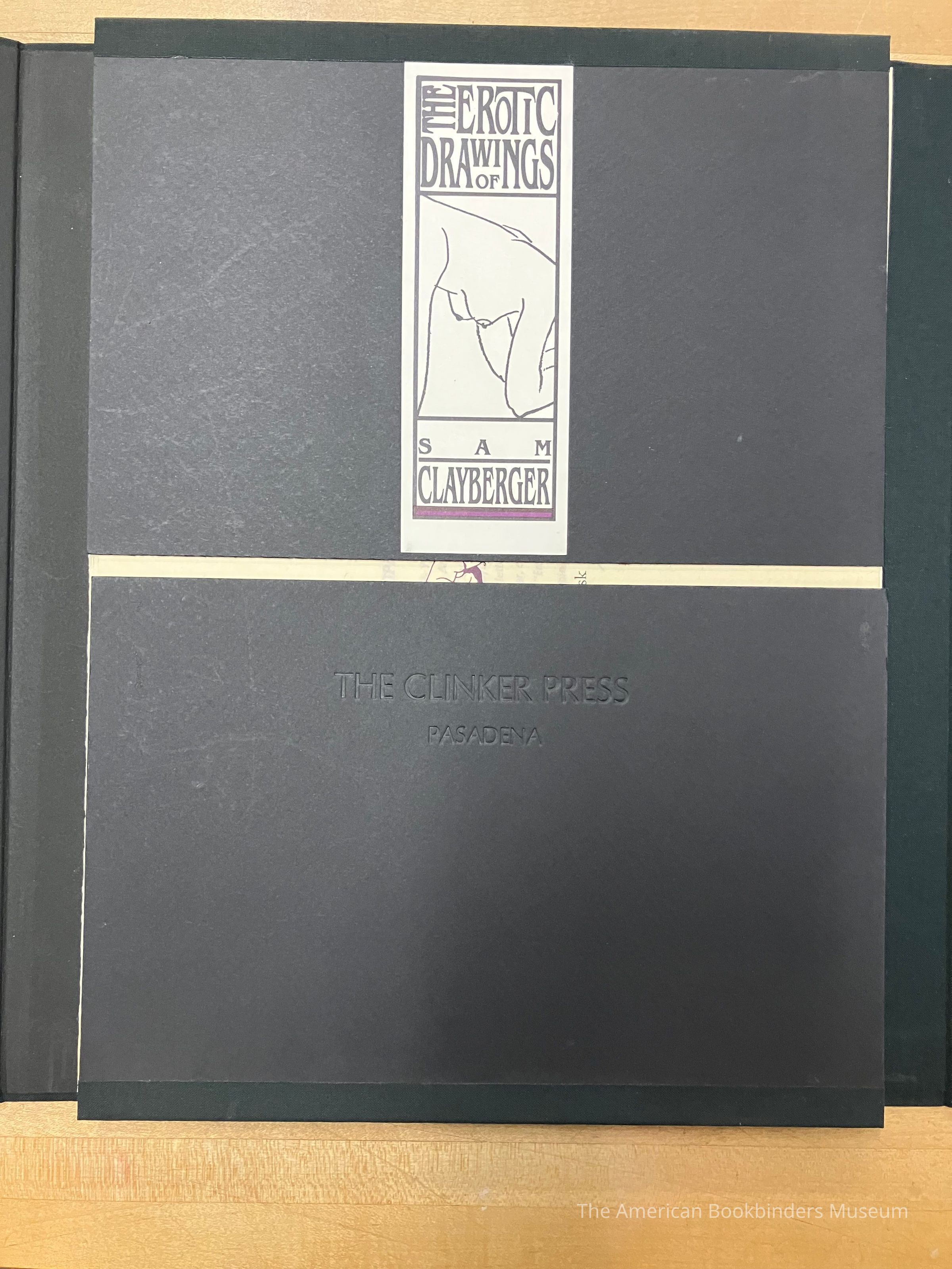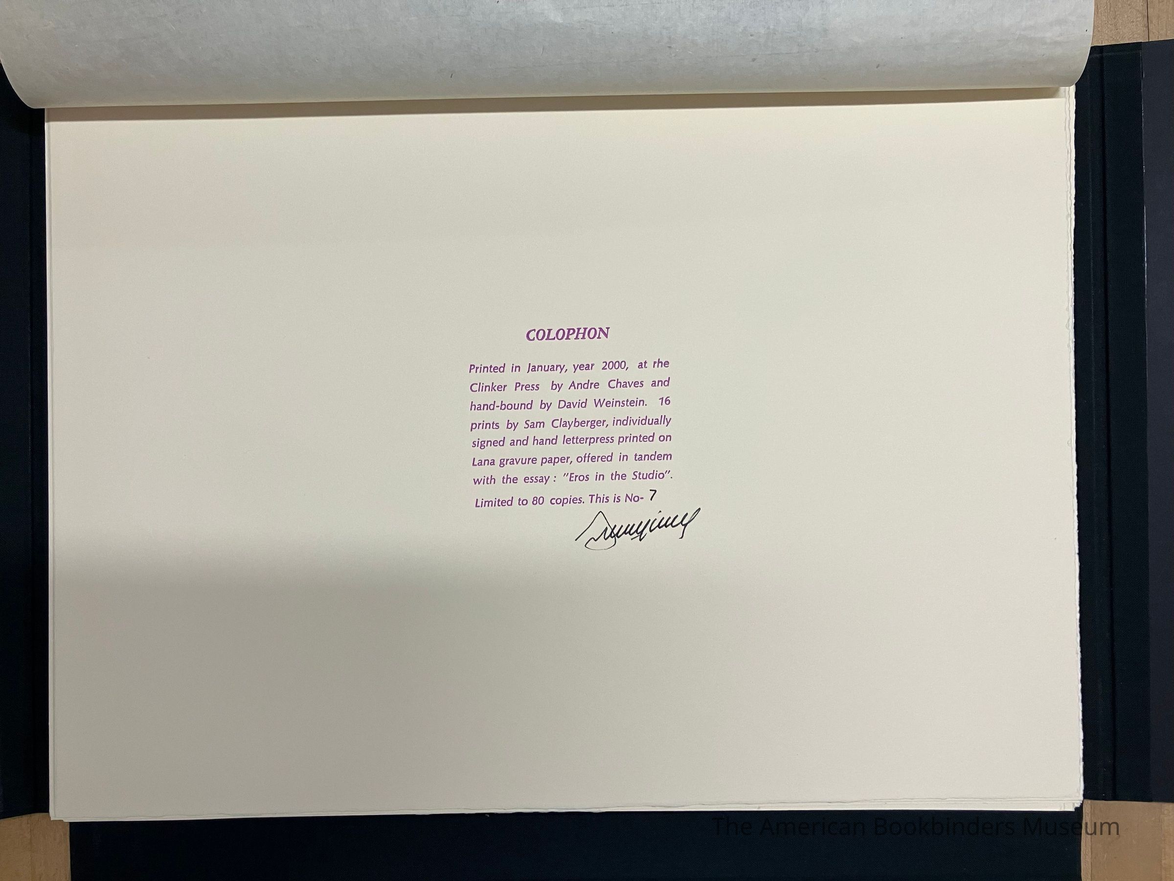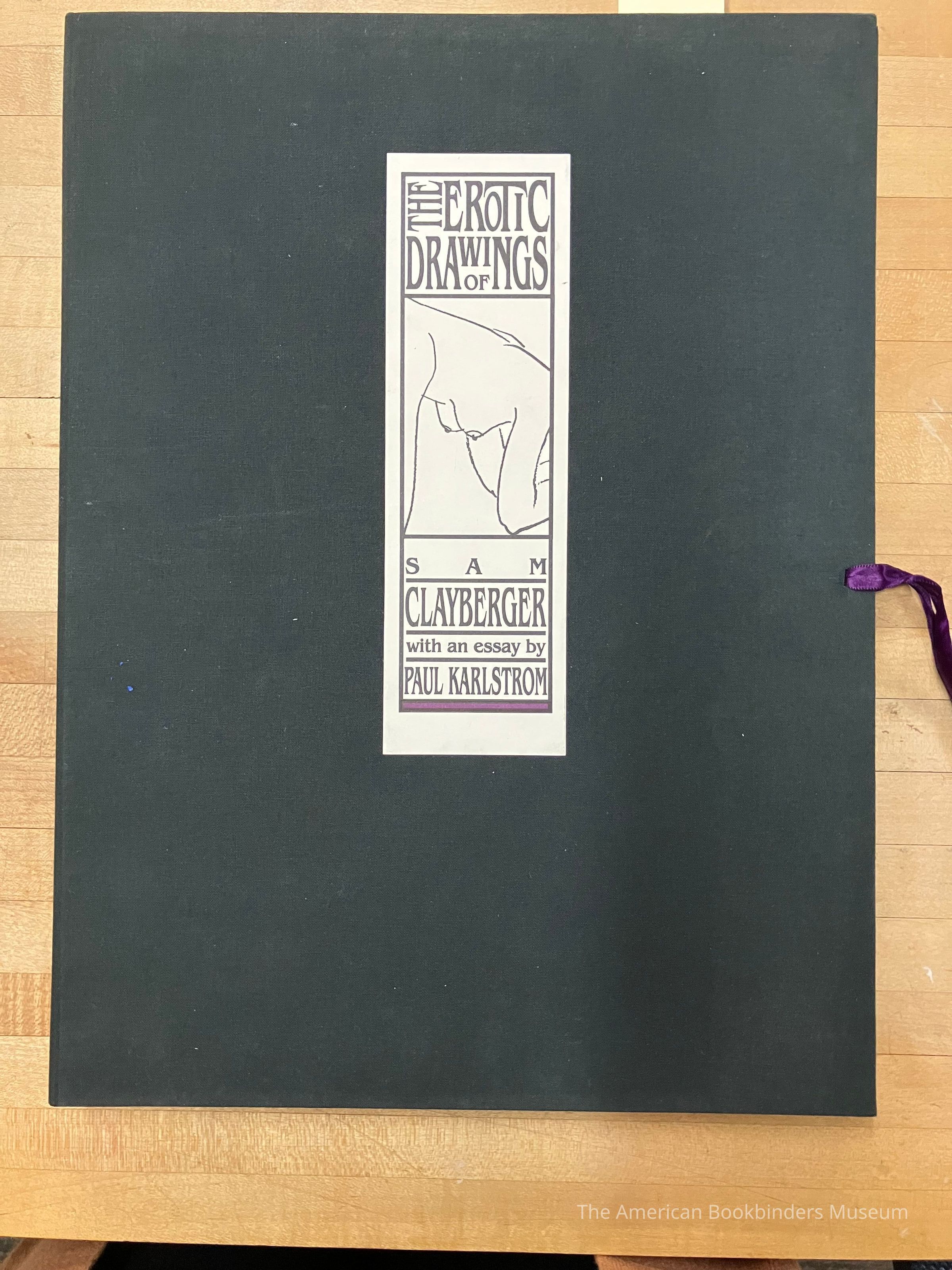 Black book cloth. Portfolio of 16 prints by Sam Clayberger, each signed. Purple ribbon closes the front cover. Opens in a set of four flaps. Includes signed colophon at the beginning. Printed on Lana gravure paper.Collection