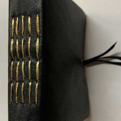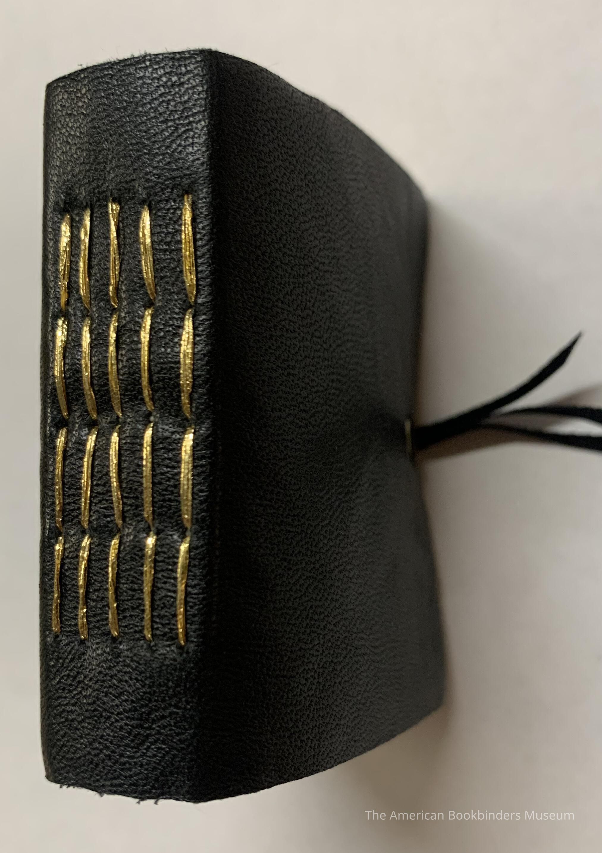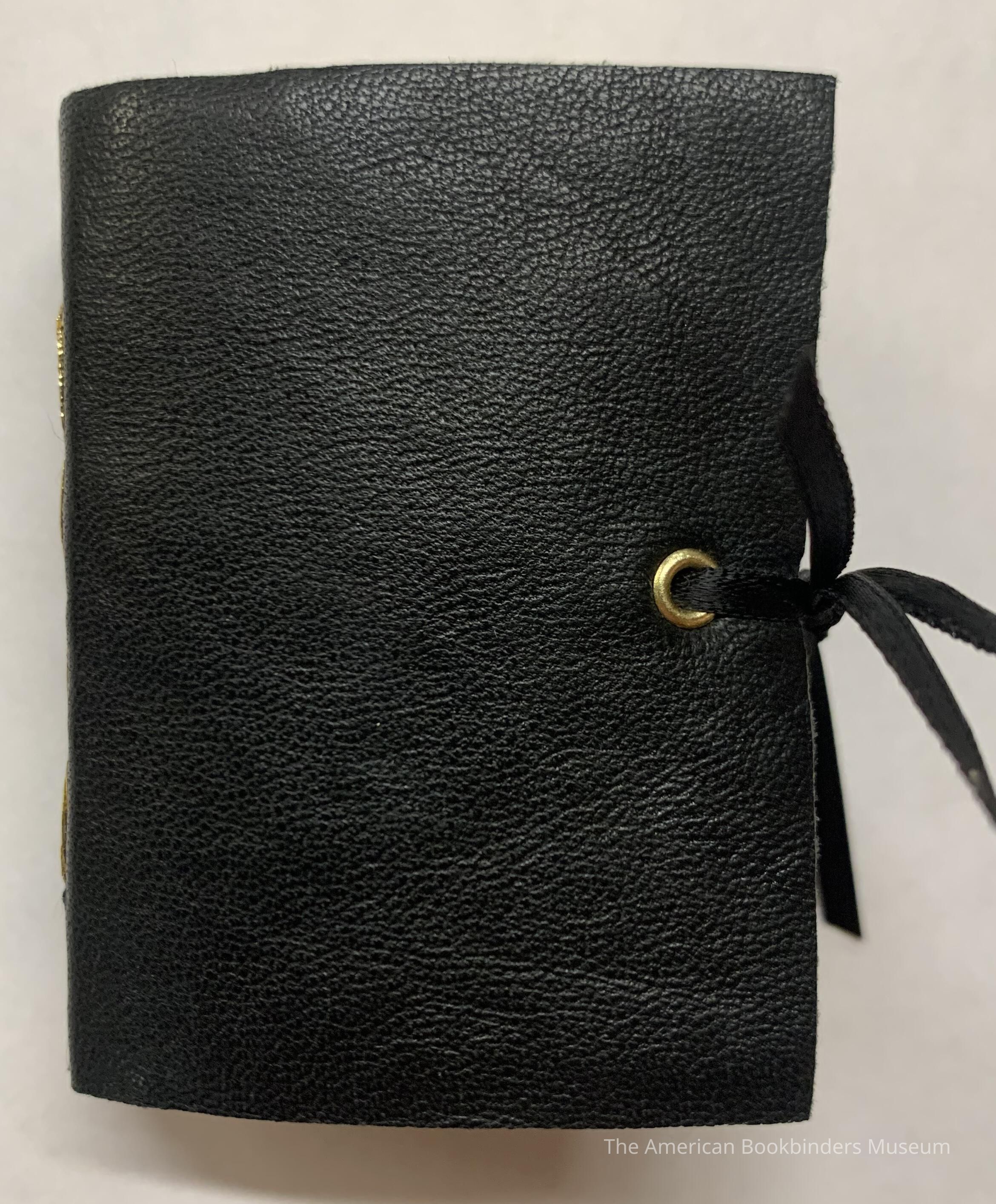 Handmade miniature book ; black leather cover, exposed gold spine sewing, black ribbon tiesEntry/Object ID