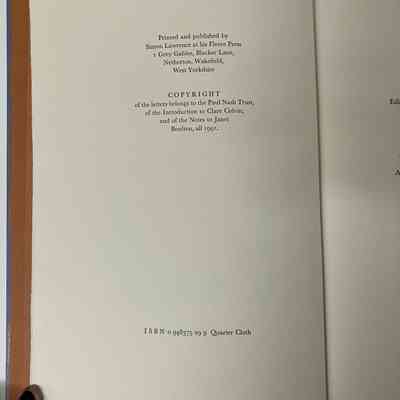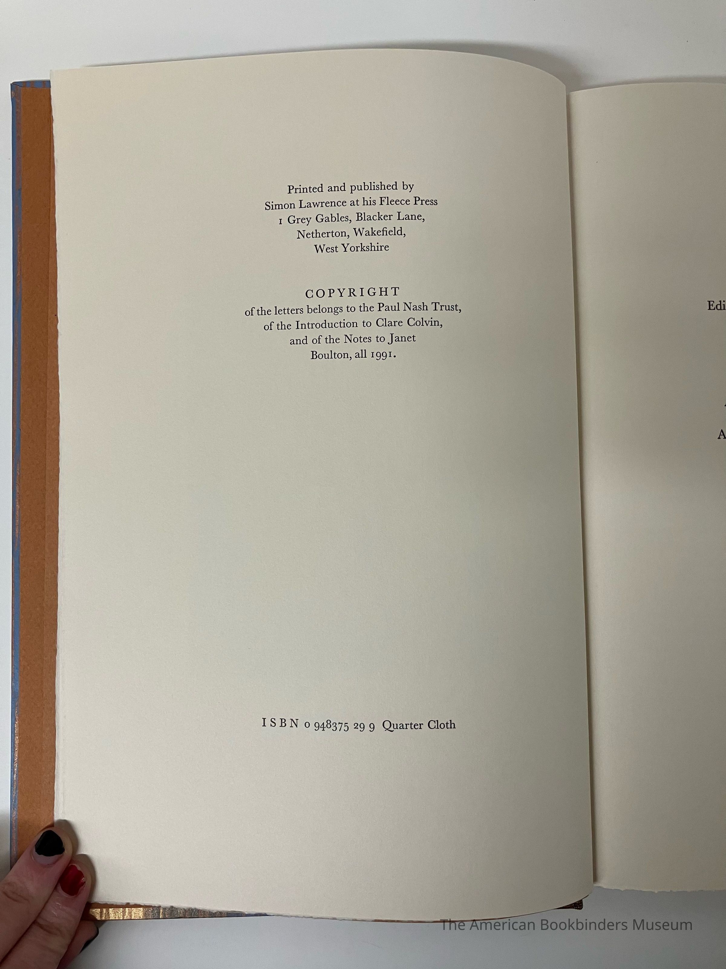 Printed and published by Simon Lawrence. Copyright of the letters belongs to the Paul Nash Trust, of the introduction to Clare Colvin, and of the notes to Janet Boulton, all 1991.