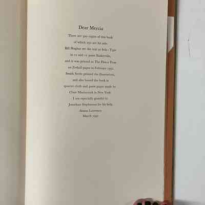 Colophon at back - 300 copies, 250 for sale. Bill Hughes set the text at Solo-Type in 12 and 11 point Baskerville, printed at The Fleece Press on Zerkall paper in February 1991. Smith Settle printed the illustrations and bound the book with paste paper by Clare Maziarczyk in New York.
