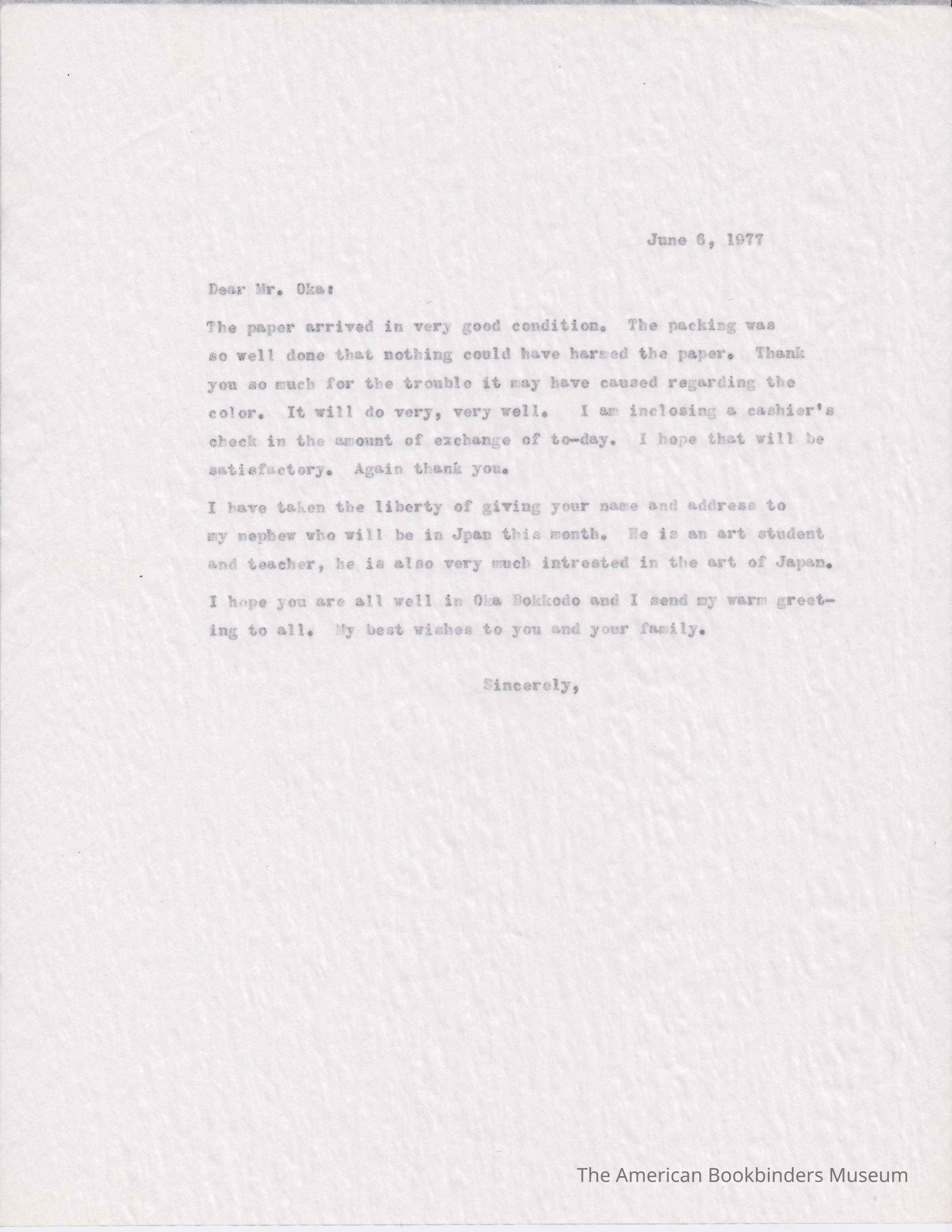 A letter from Patri letting Oka know the papers discussed in 2023.9.9.v have arrived. The receipt of a check for said papers. A sample of the papers. A bill from Oka.Collection