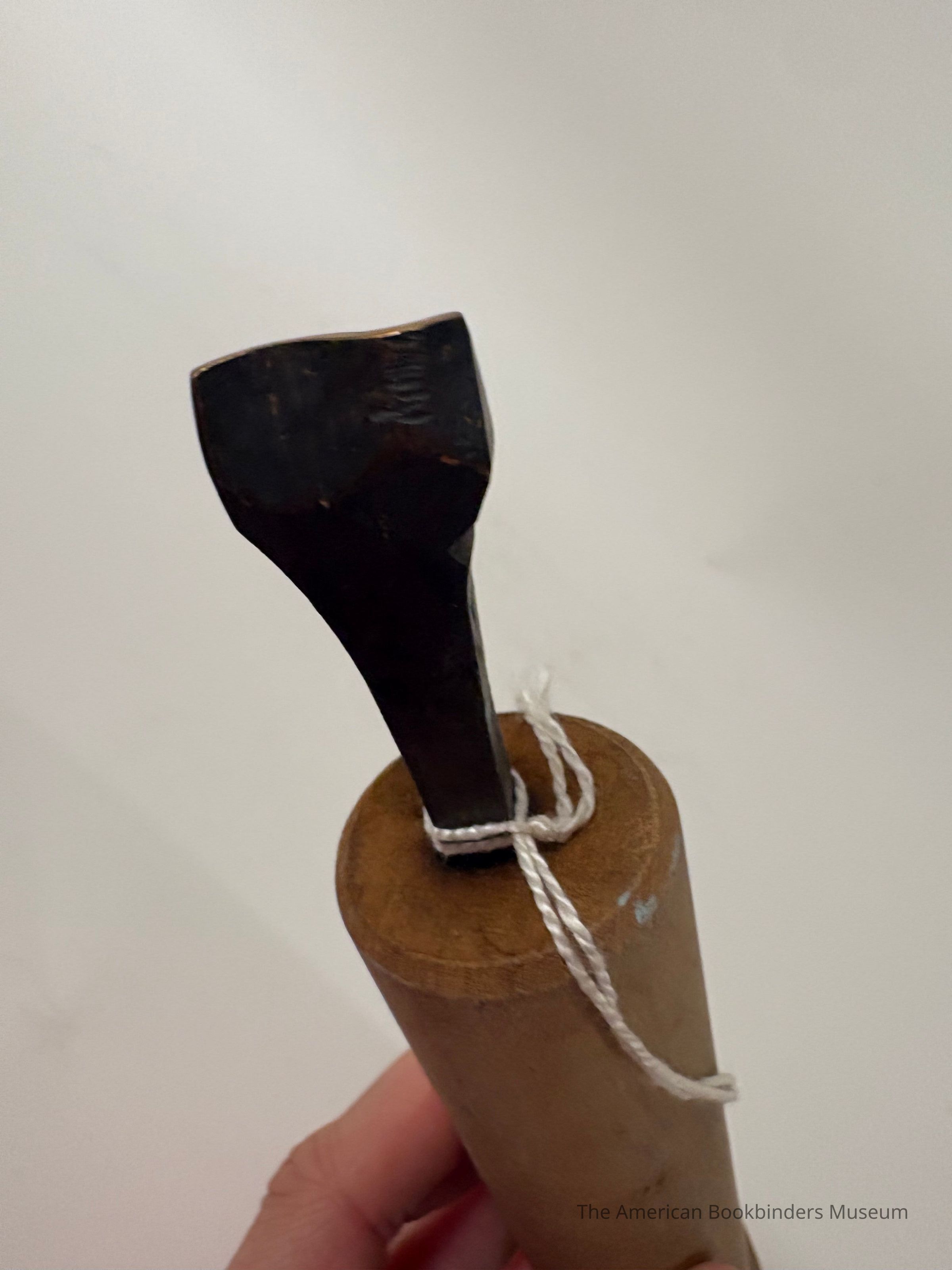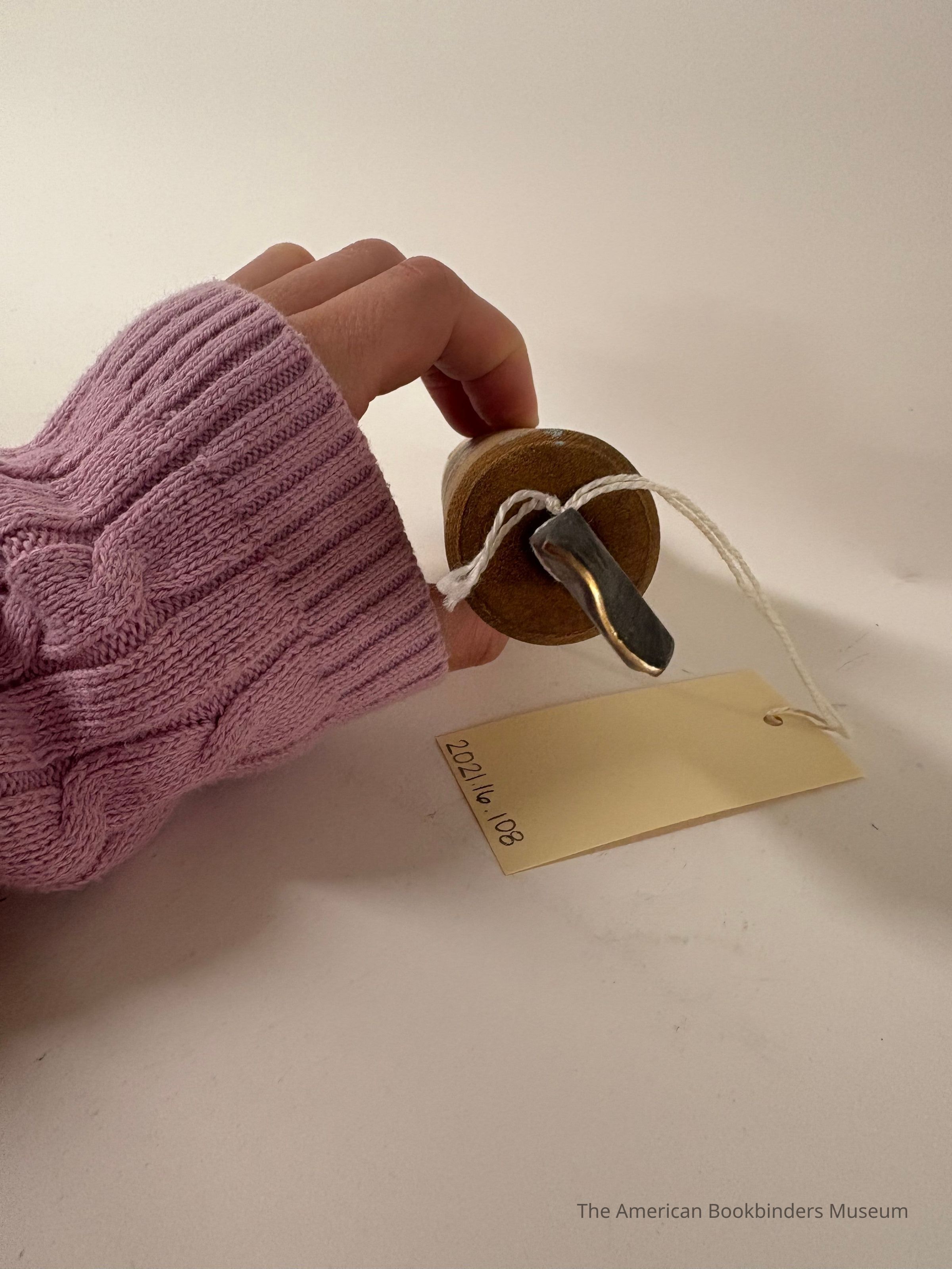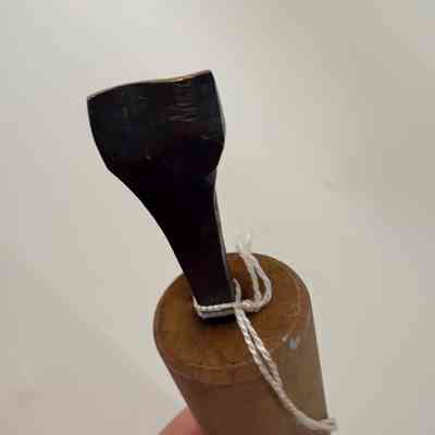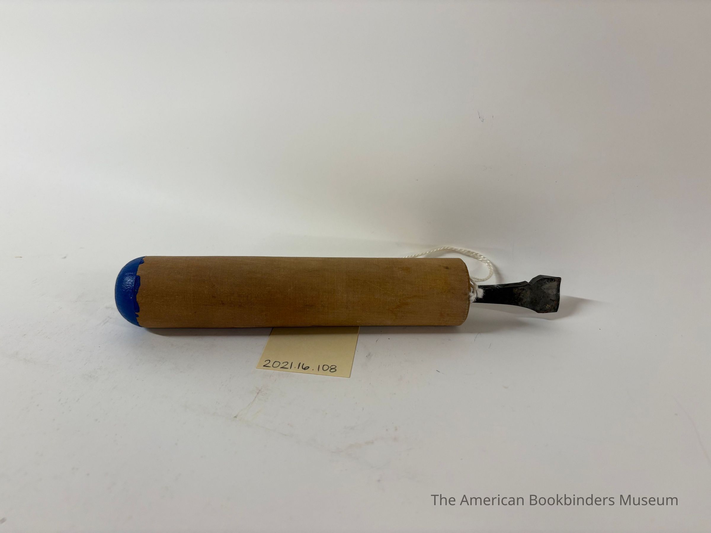 Hand stamp with a 1.7 cm design of a curved line. The end of the handle is painted blue.