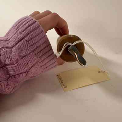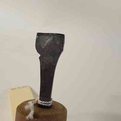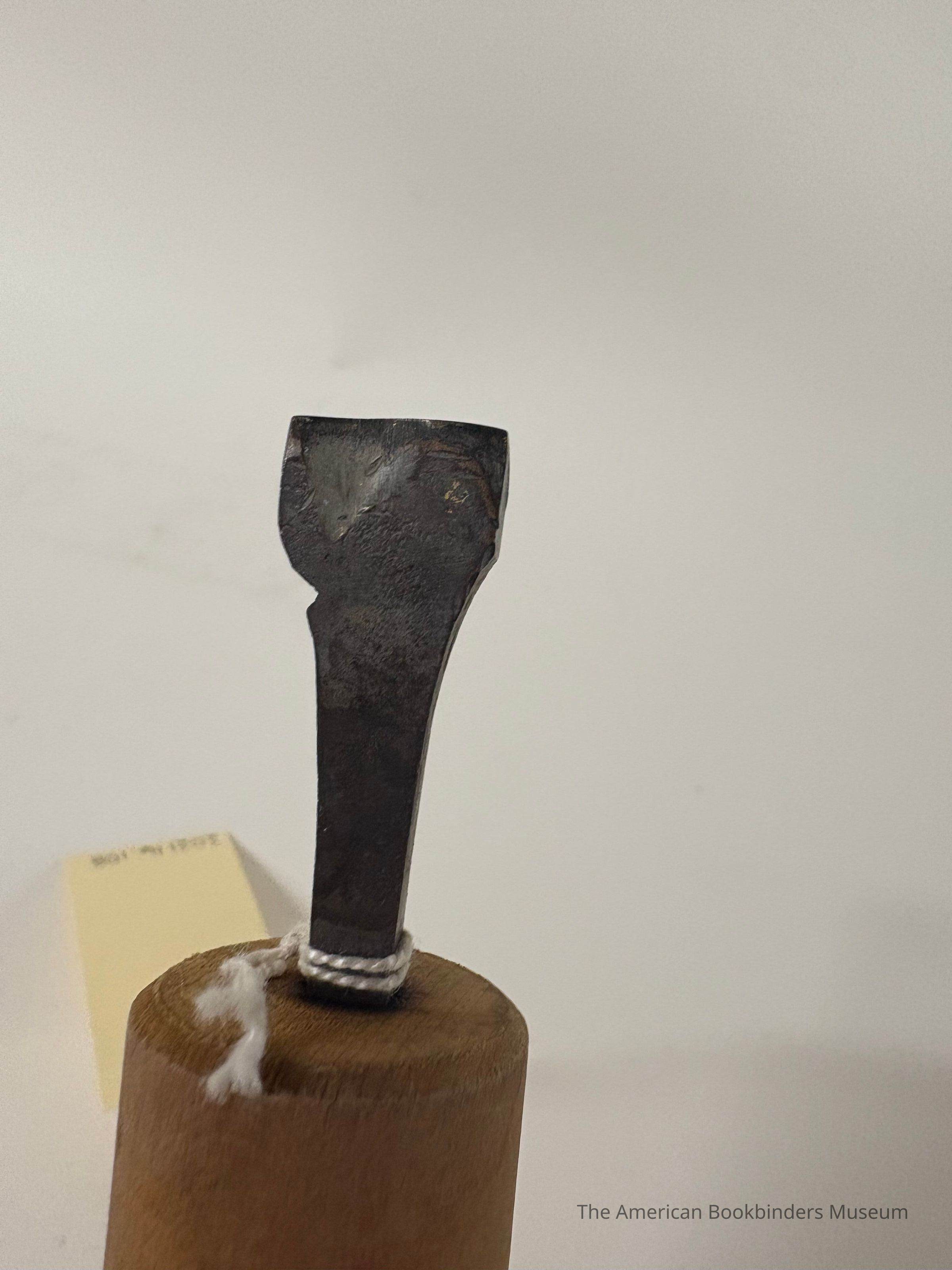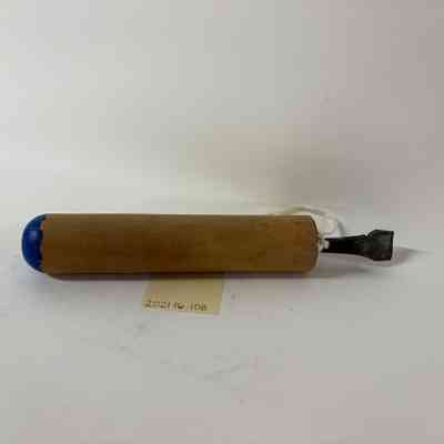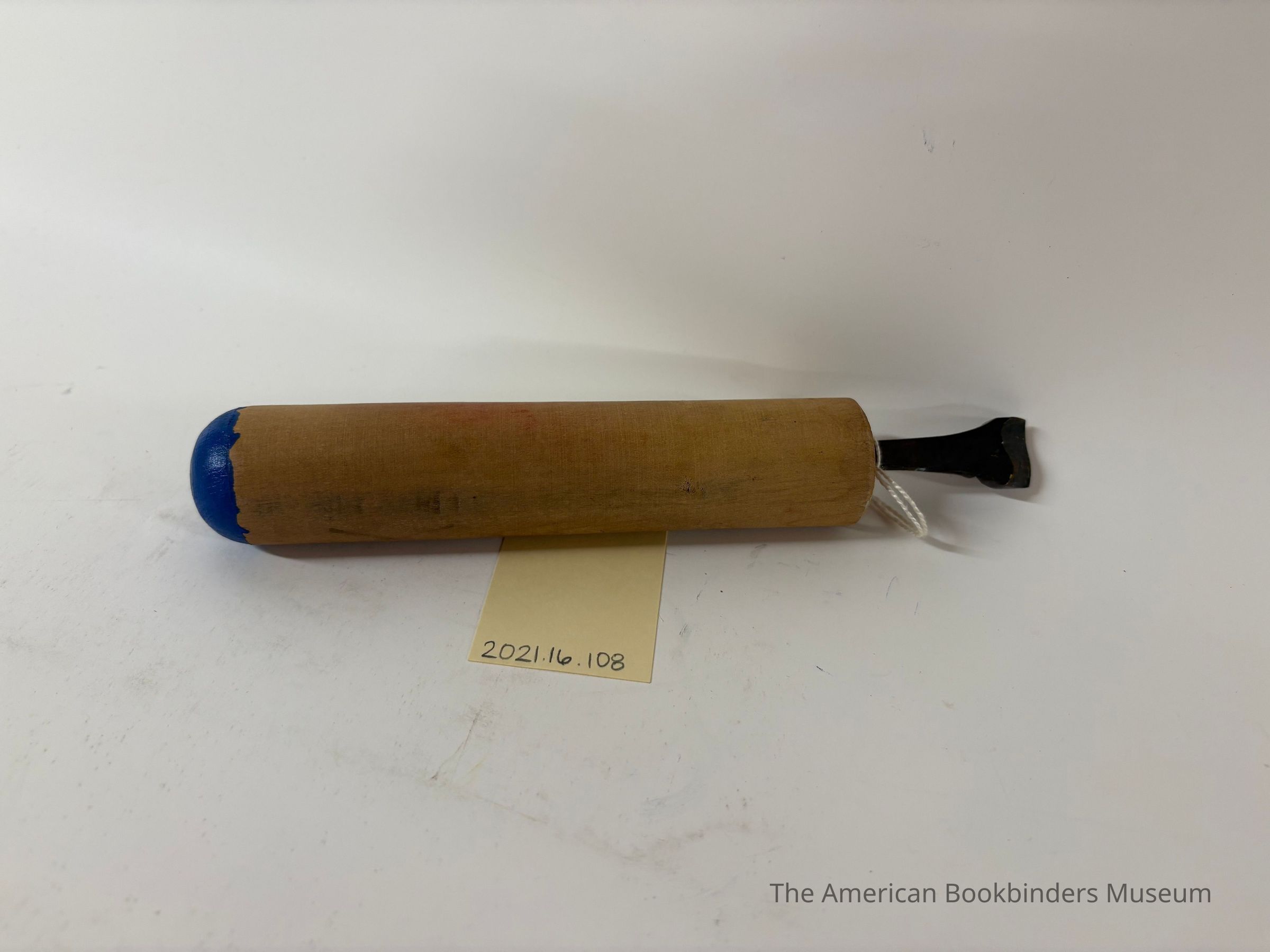 Hand stamp with a 1.7 cm design of a curved line. The end of the handle is painted blue.