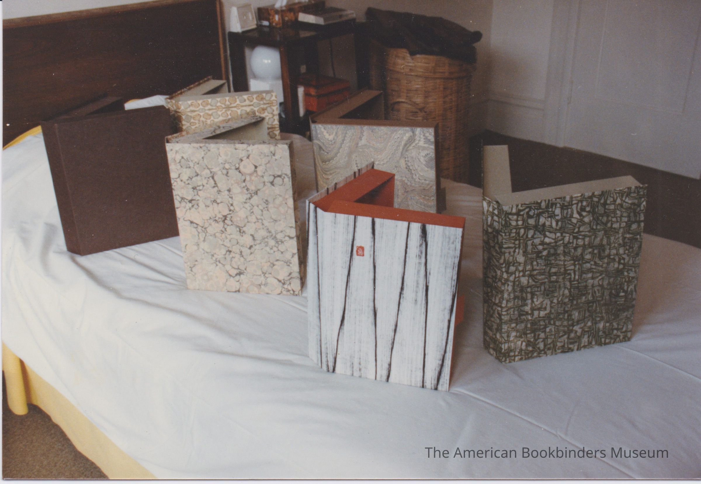 Six drop spine boxes (clamshell boxes) are standing upright on a mattress. Same are shown in 2023.9.11.co through 2023.9.11.ct. The layout is the same as 2023.9.11.co, but at a different angle.Collection