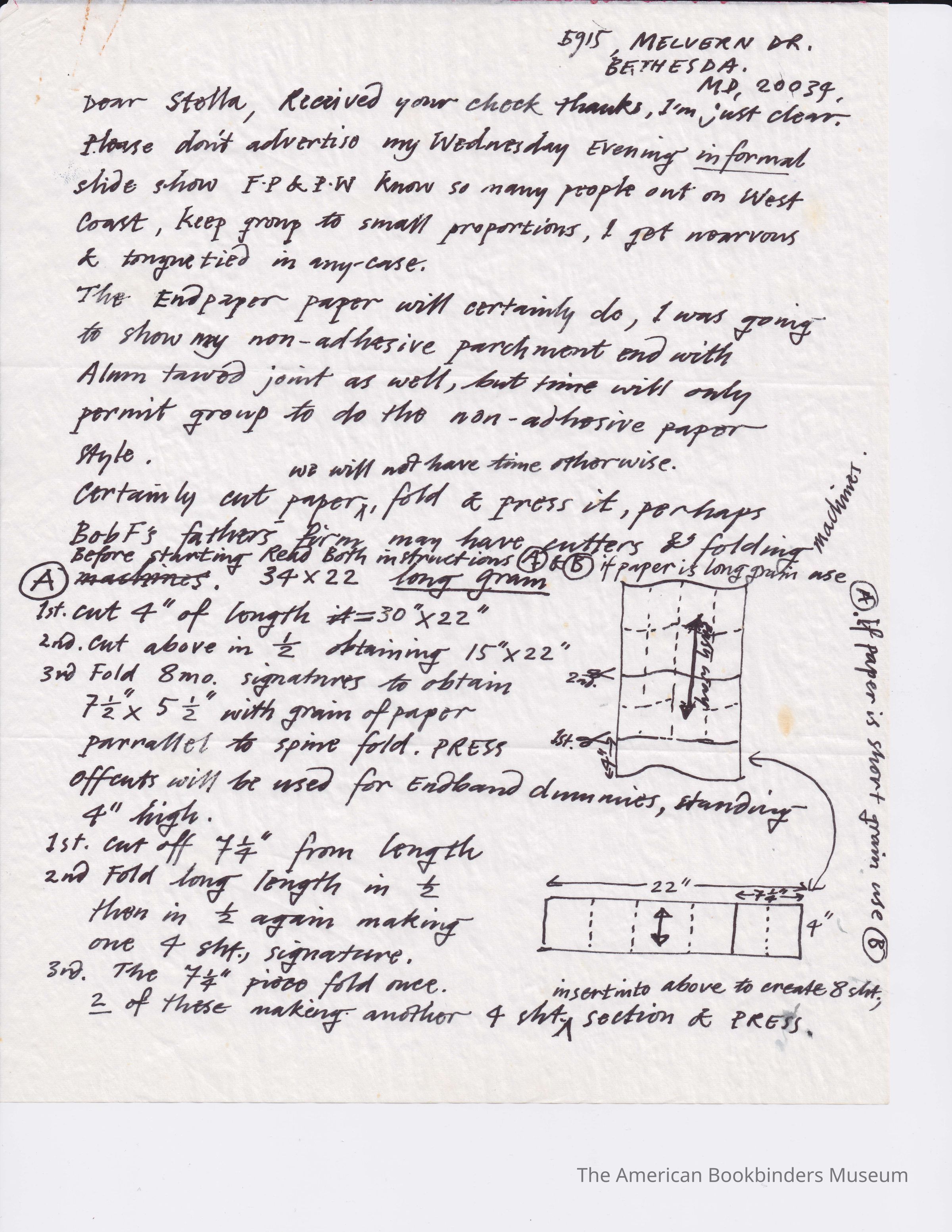 A letter from Clarkson about preparing pages for the limp vellum binding workshop.