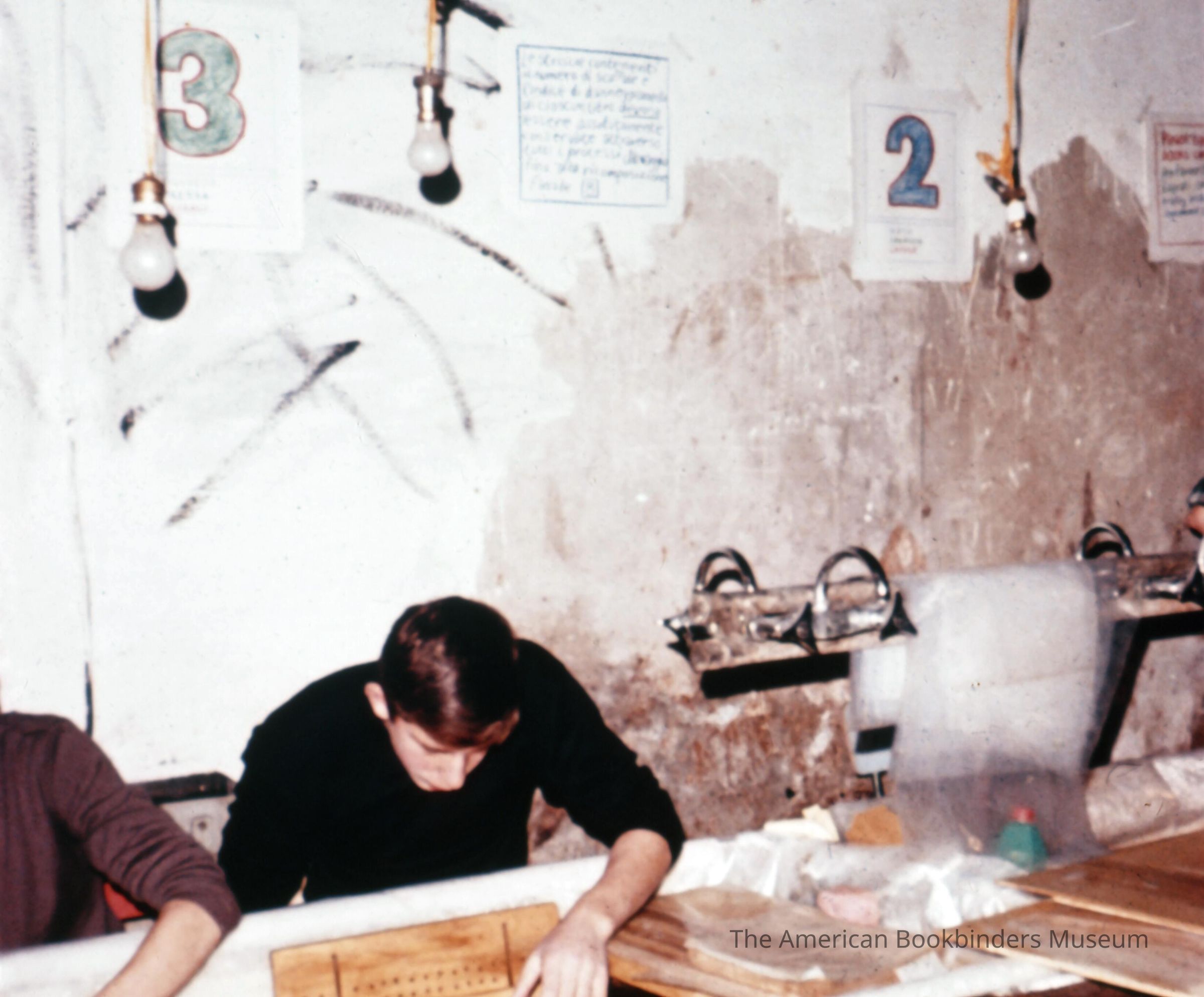 Scan of a slide showing a conservator at work. Lightbulbs hang from the ceiling. Plenty of things are strewn around the table.Photograph Details