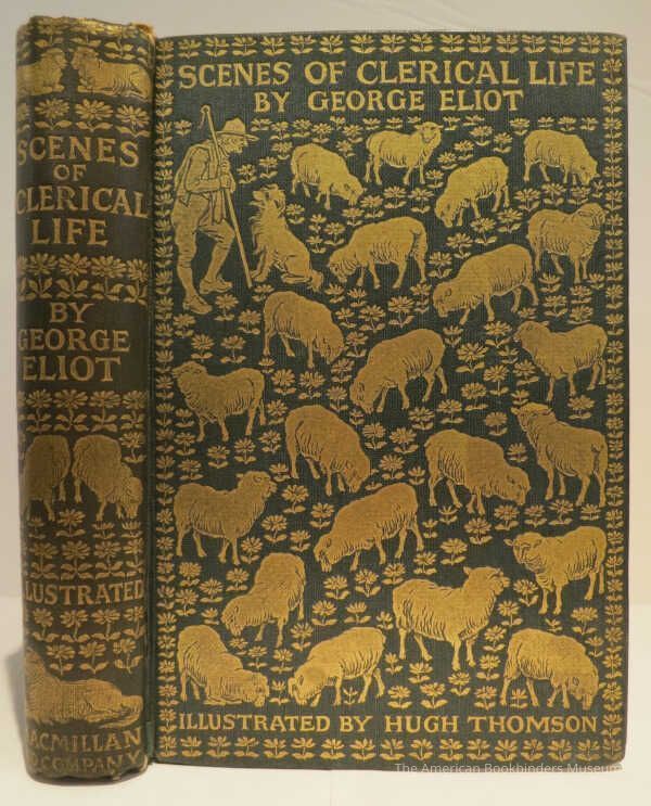 Bound in dark green cloth with unsigned cover design attributed to Hugh Thomson. Highly embellished gilt stamping of shepherd and pasturing sheep within floral border, motif repeated to spine. All edges gilt. Plain endpapers with Christmas gift inscription.Notes