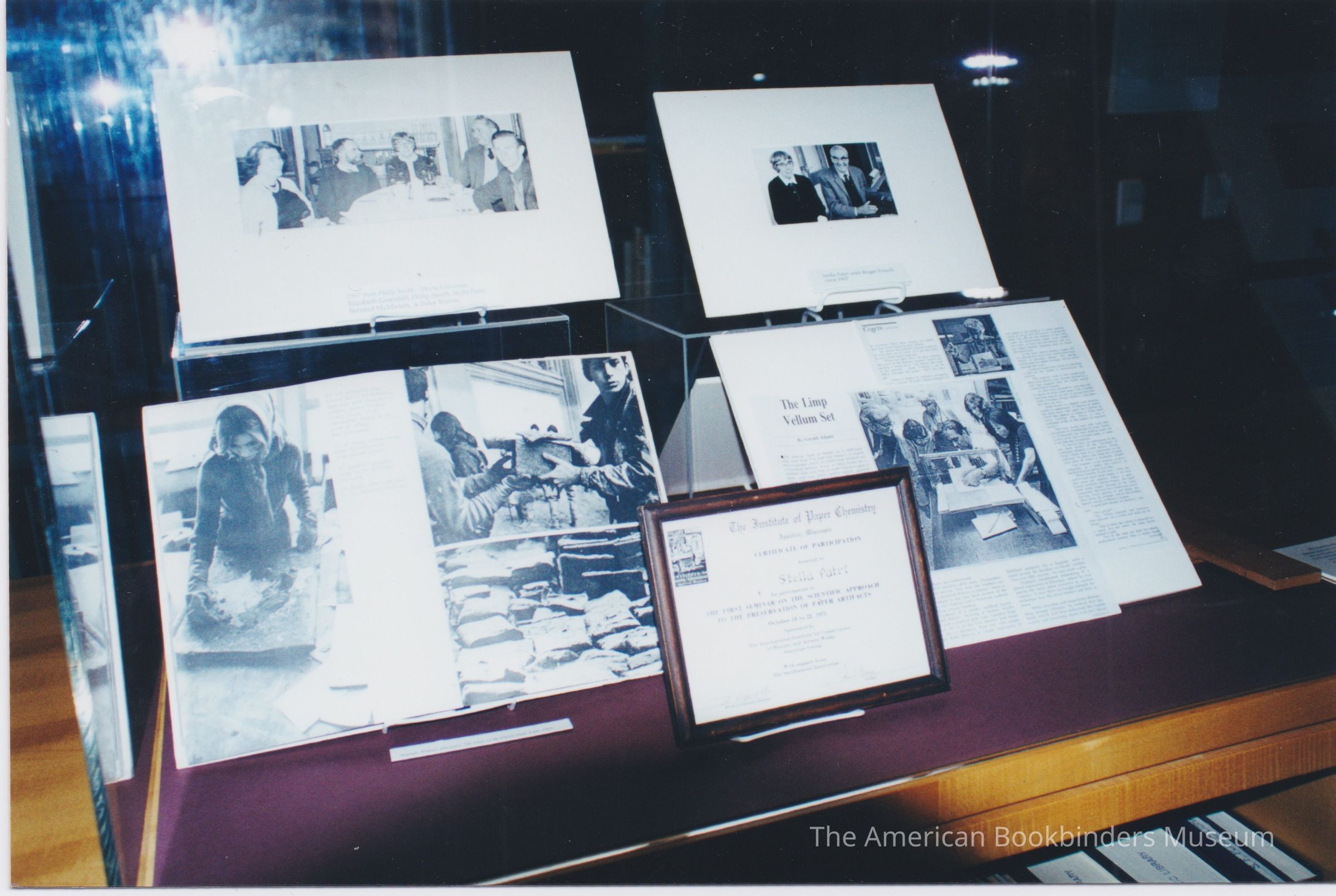 Display case showing various items, including a print of 2023.9.11.d. There is also a news paper with the headline 'The limp Vellum Set'. At the front is a Certificate of Participation from the Institute of Paper Chemistry, awarded in 1973 for 'the First Seminar on the Scientific Approach to the Protection of Paper Artifacts'.Photograph Details
