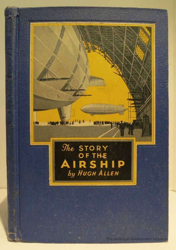 Bound in blue pebbled cloth with a paste onlay illustration of a silver US Navy zeppelin hovering, and one parked within a hangar, set against a yellow background.Notes