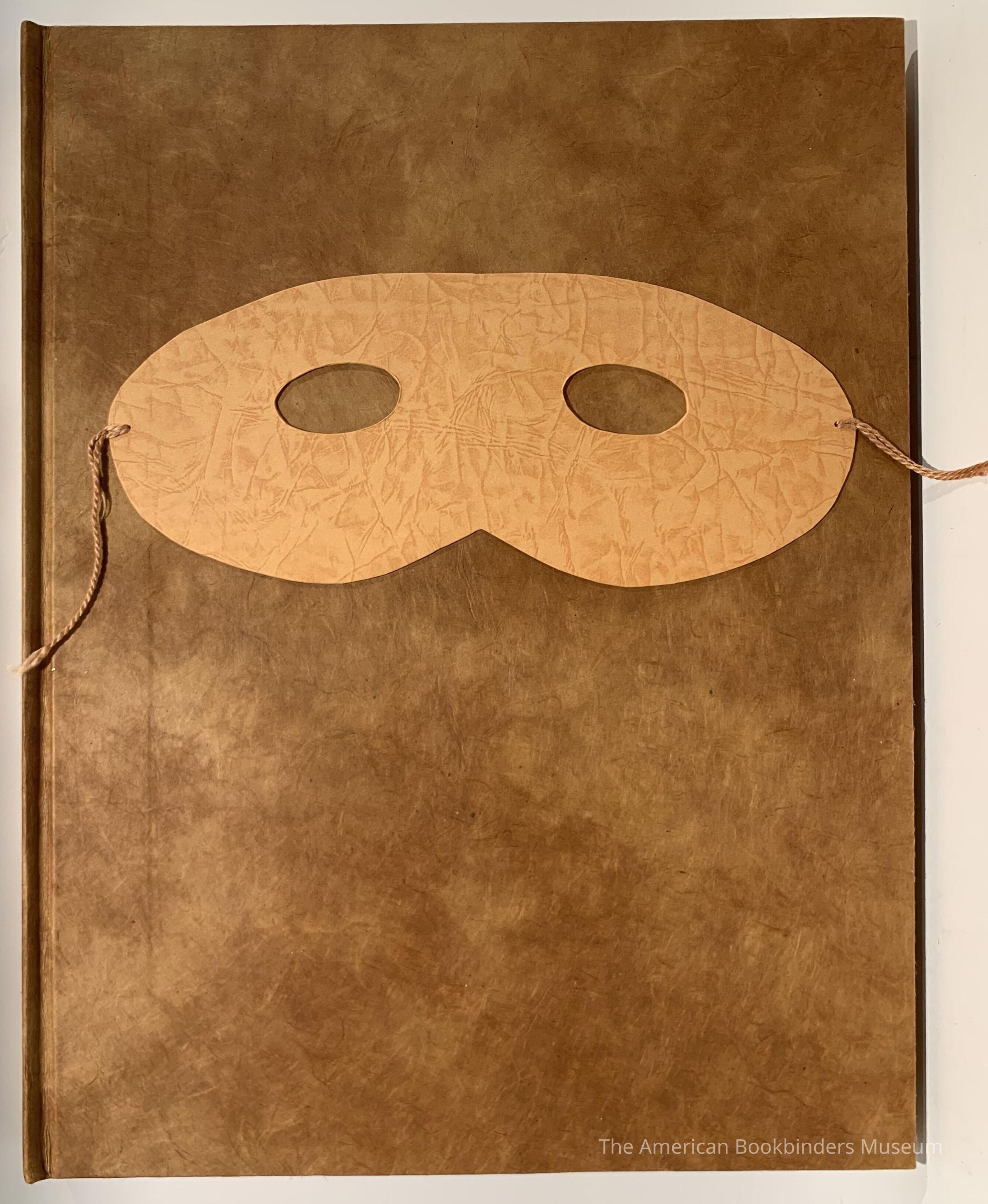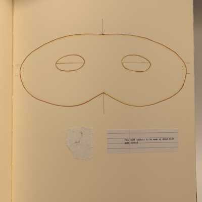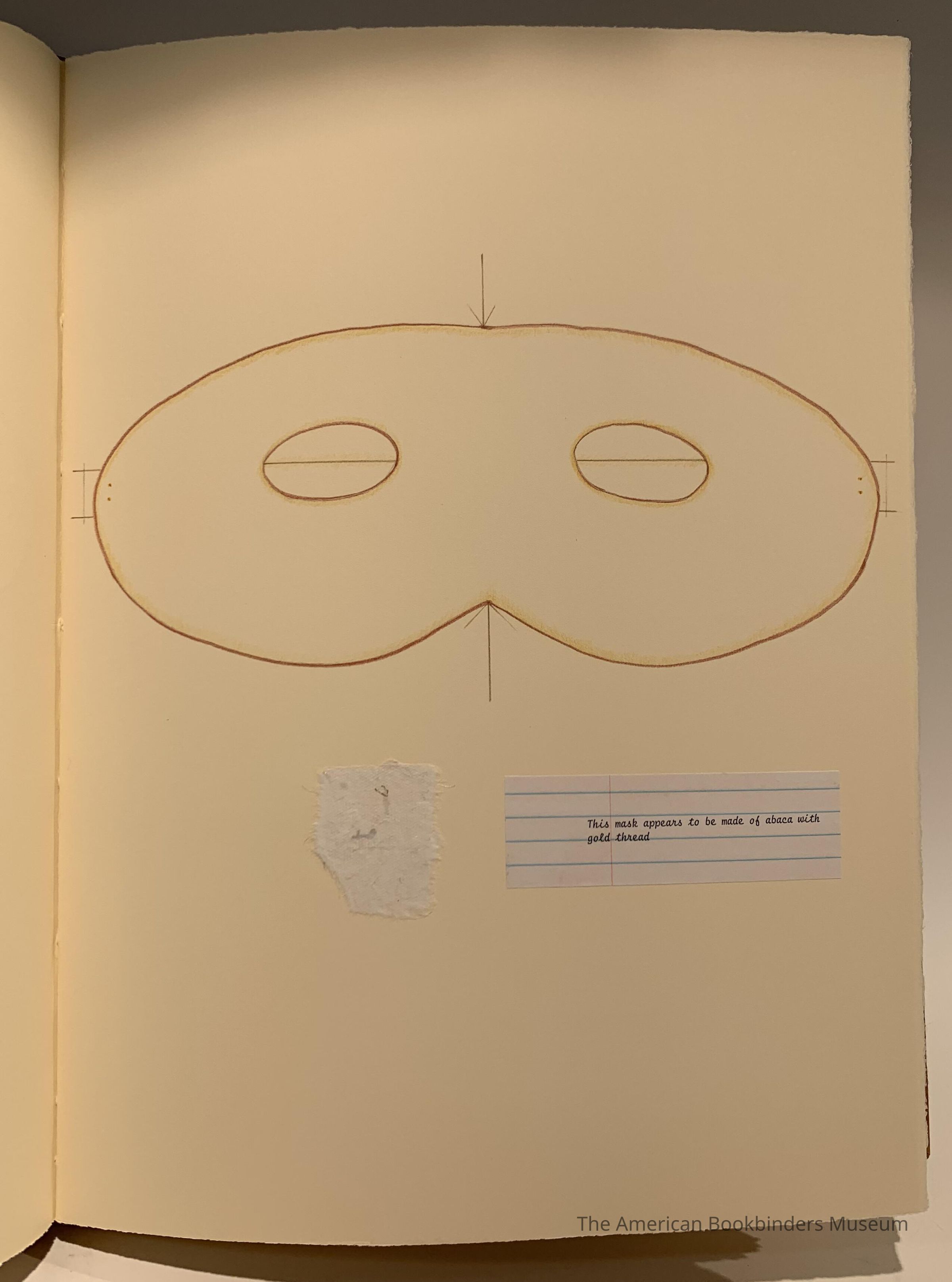 Folio handmade book; appox 30 deckle-edge pages; many with diagrams of masks and various handmade papers of the masks identified. Appears to identify the papers used for The Ancient Mask Kit (2021.11.13)Collection