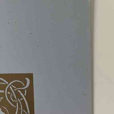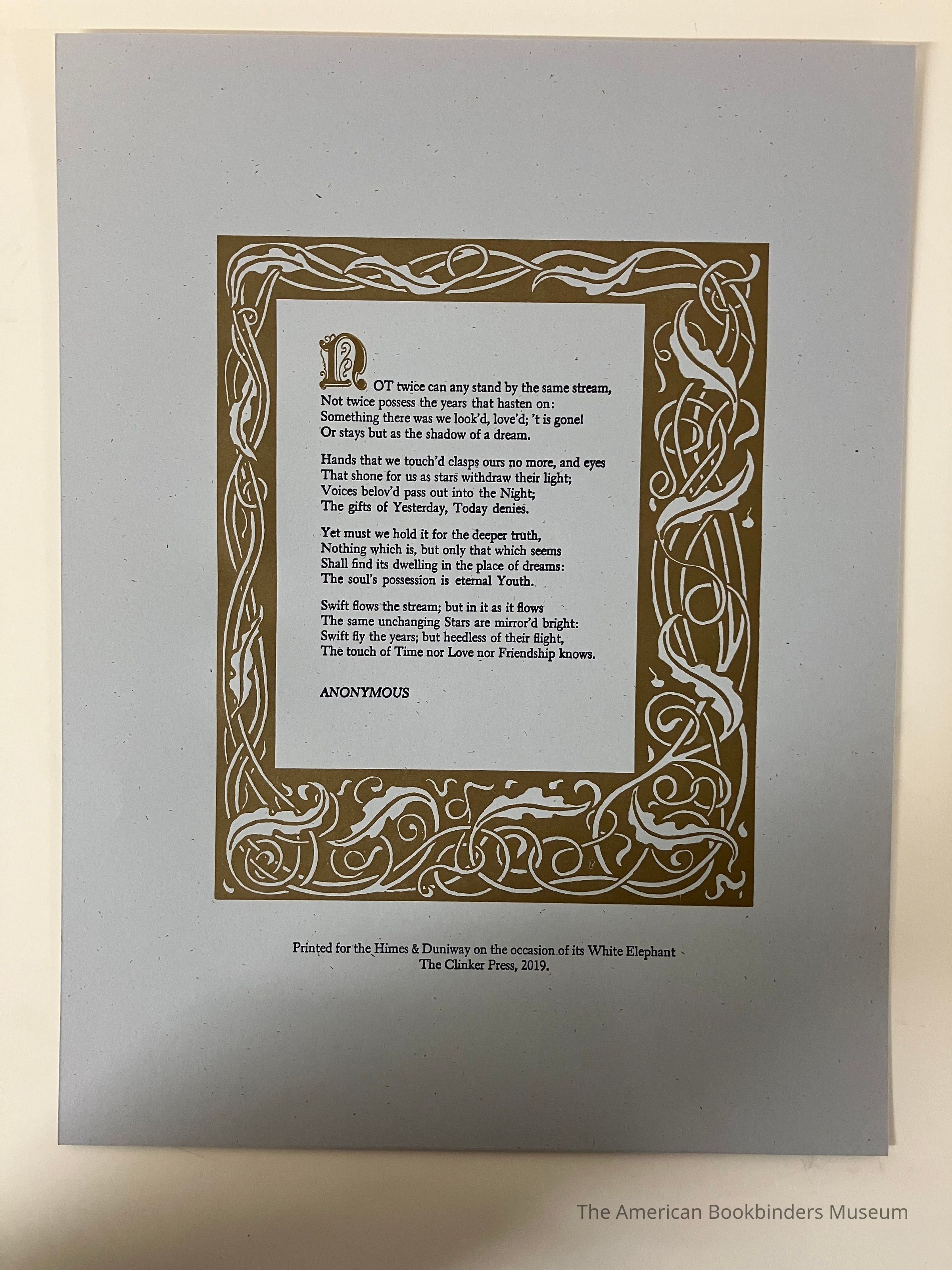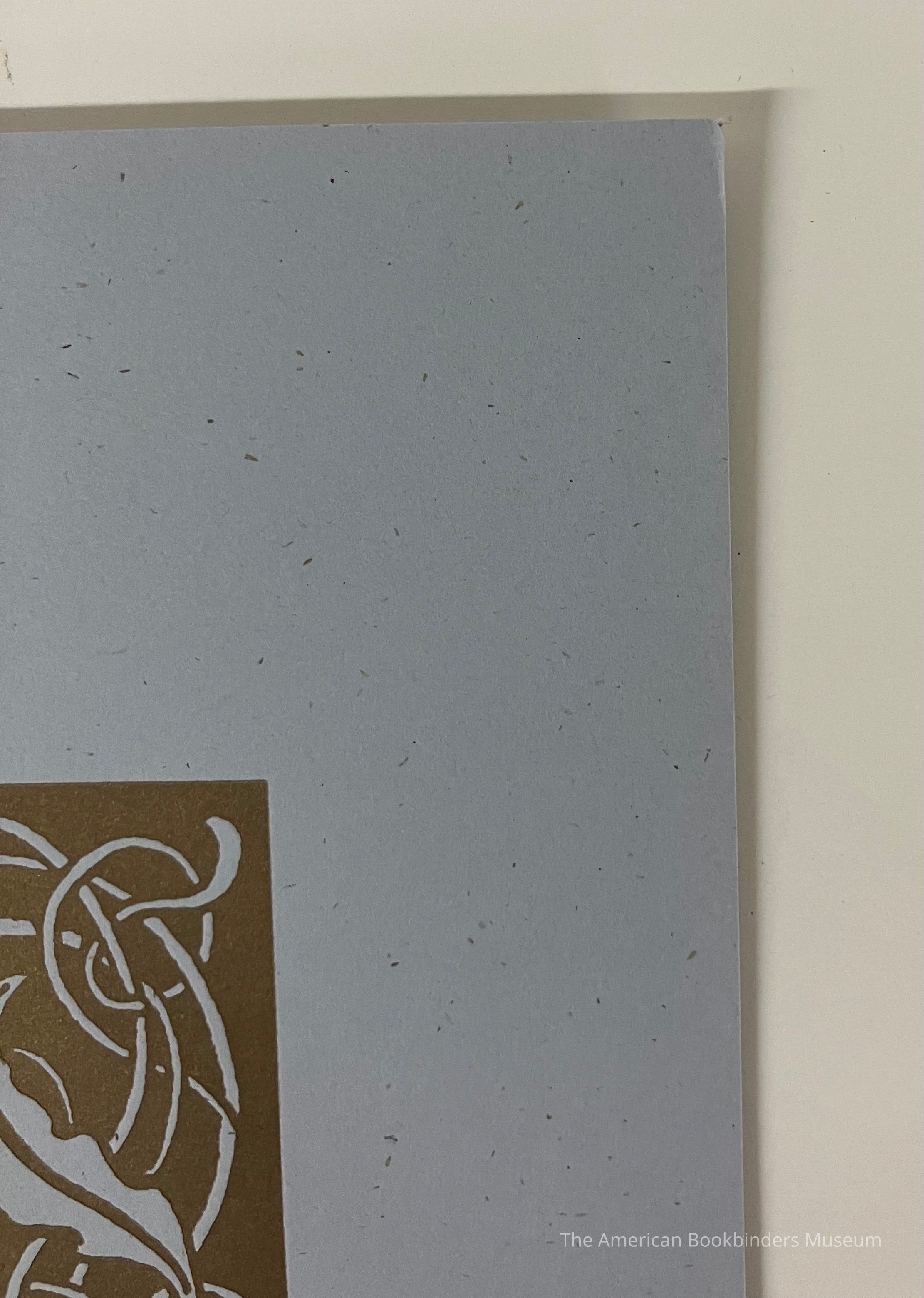 Blue paper with brown flecks. A border made of leaves and curling vines in brown. Same color used for the drop cap. Below the frame is context and printing information. Text in black.Collection