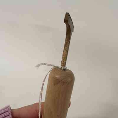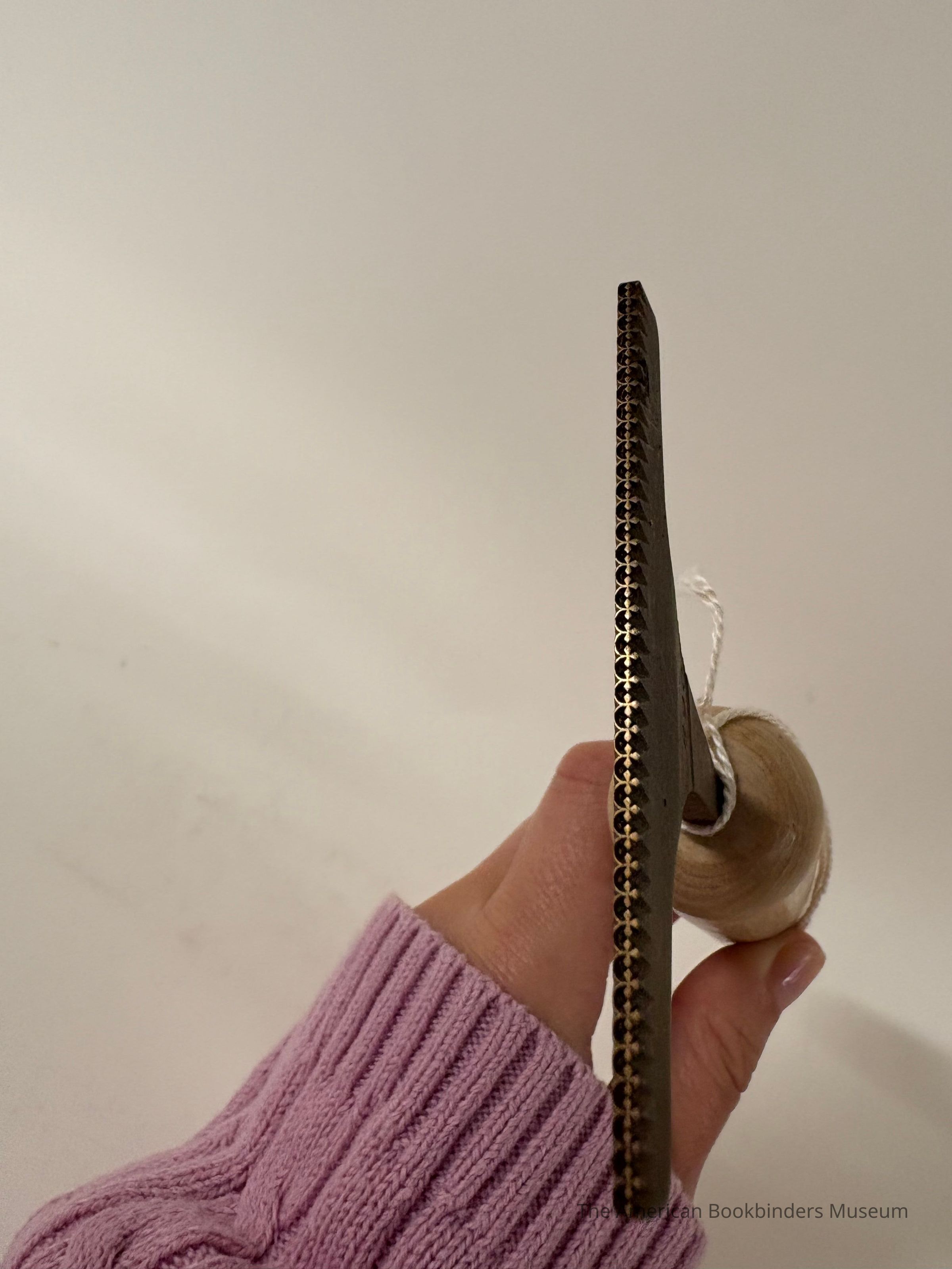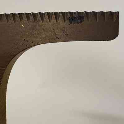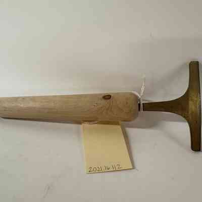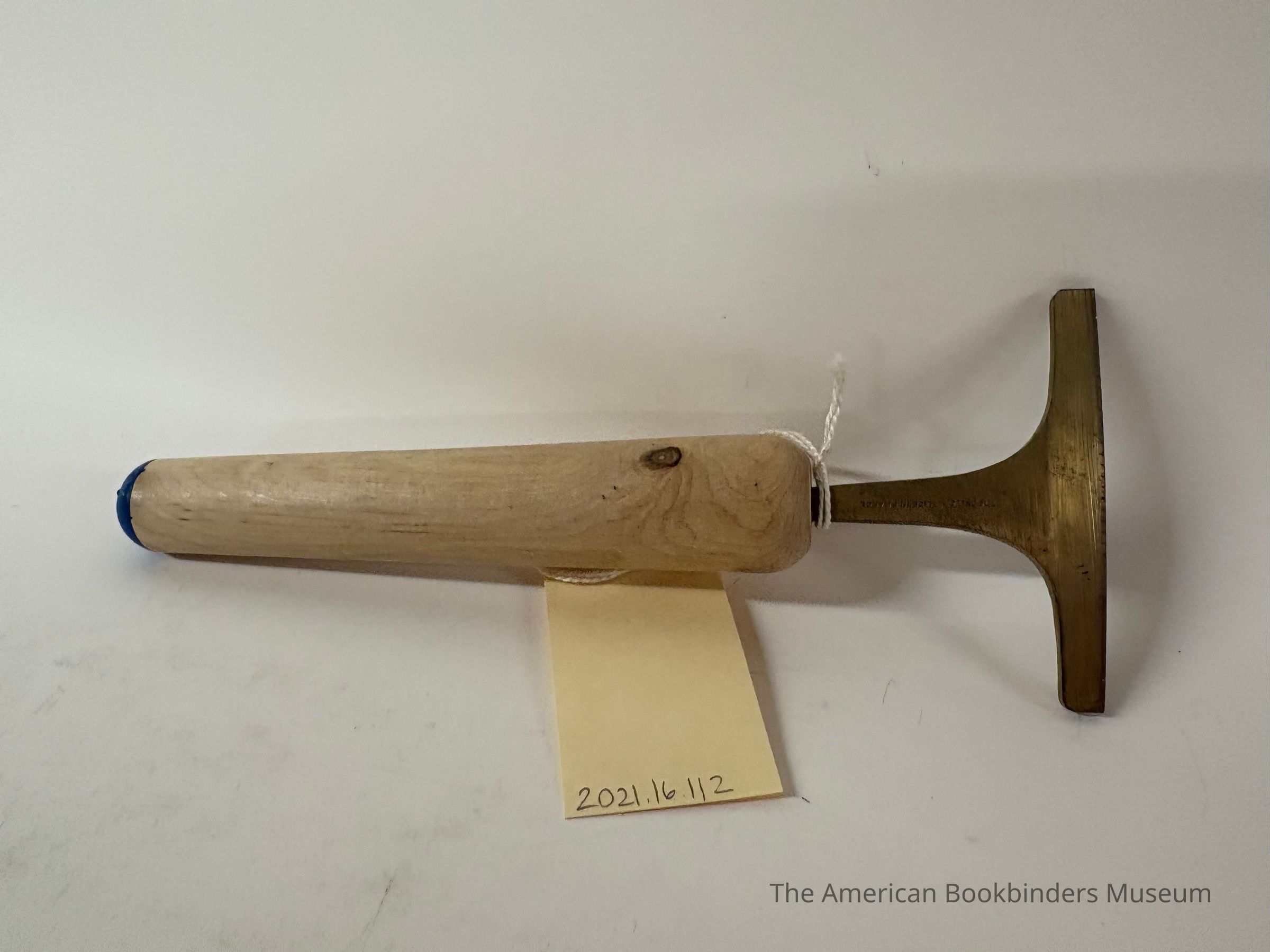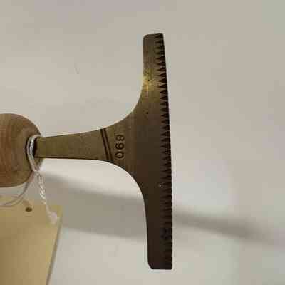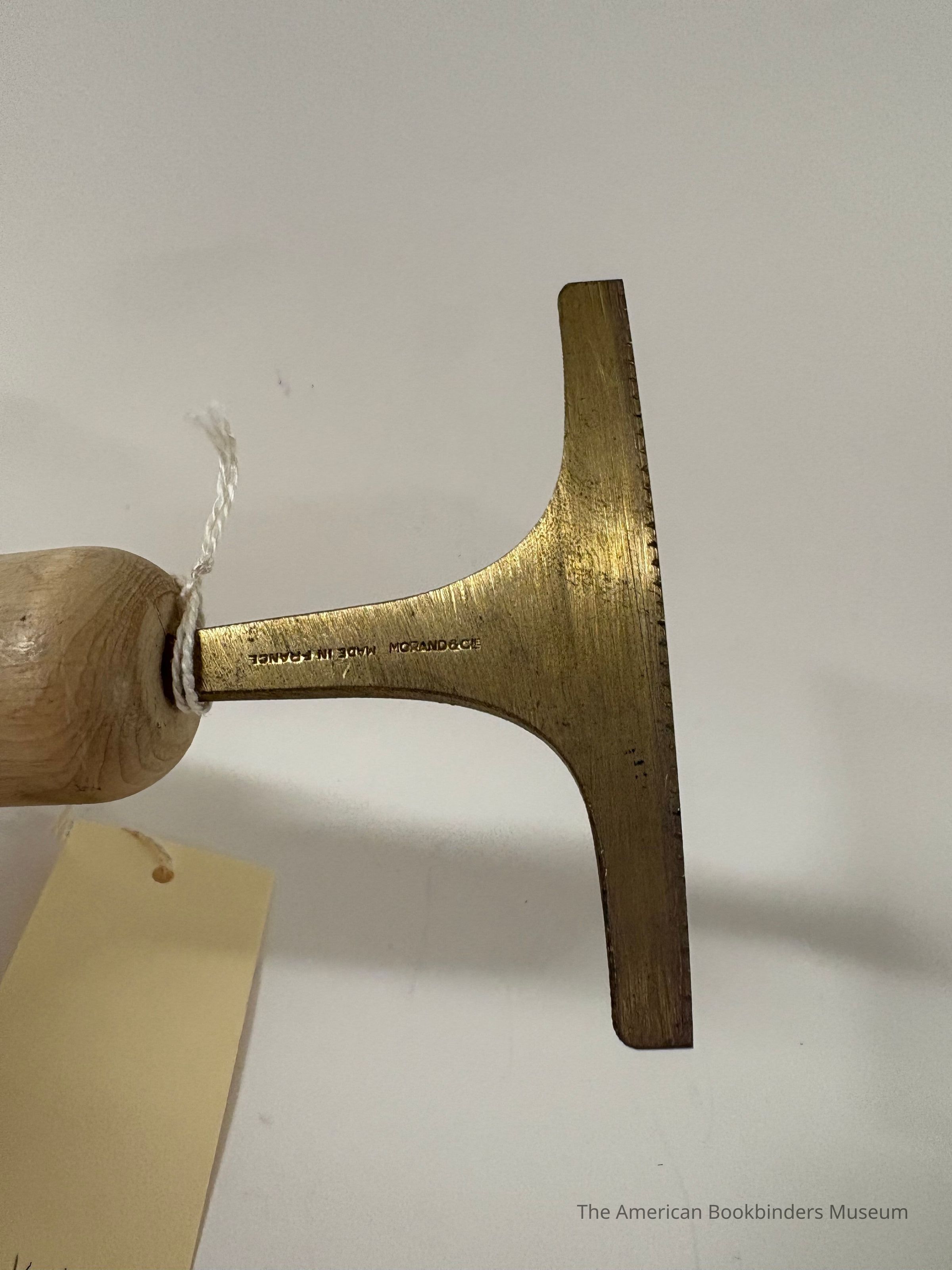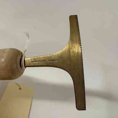 Decorative brass pallet of an 8 cm clover shape motif on a wood handle. The end of the handle is painted blue. Manufacturer is Morand & CIE.Collection