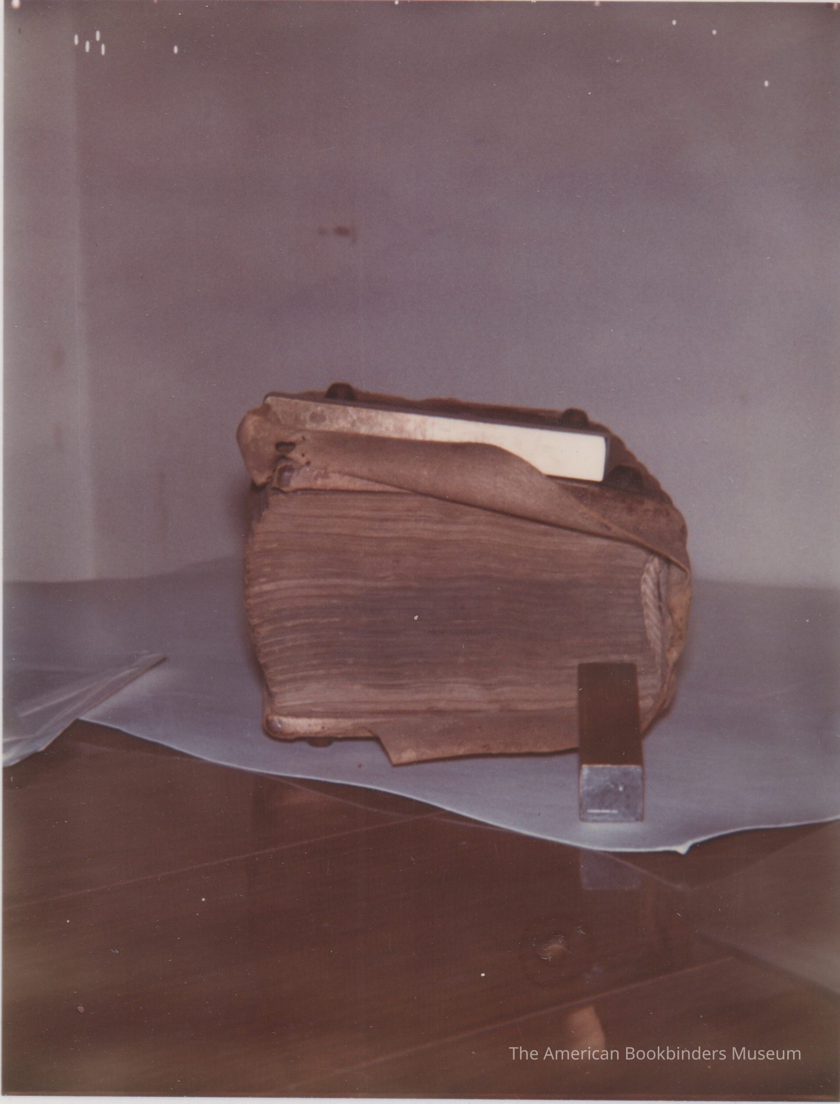 A book with the tail facing the camera. The leather forming the cover is pulling away, and is head down by a metal bar.Collection