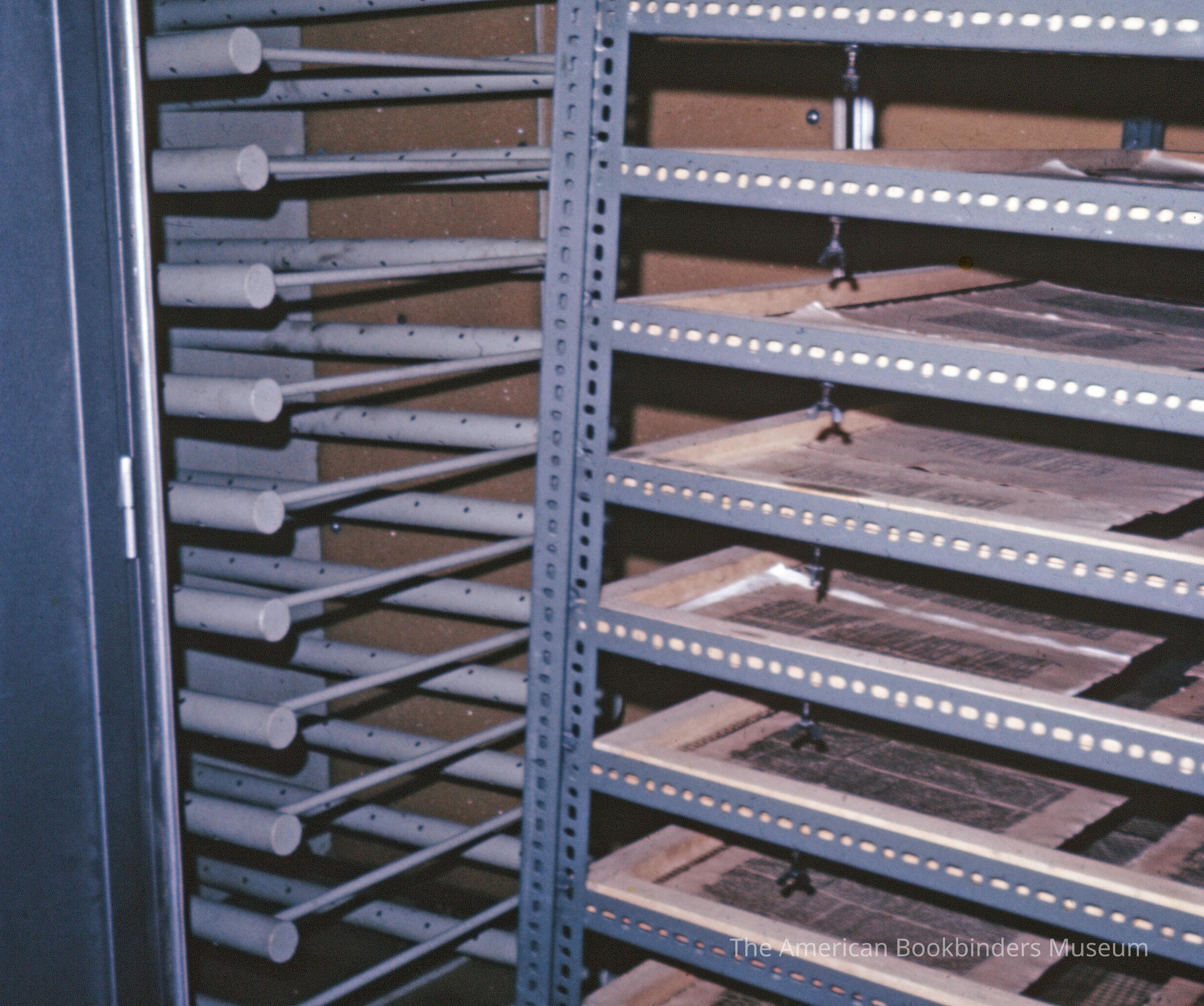 Scan of a slide. Shows a vertical rack system to the left. Shows racks with pages from a book laid flat to dry.Photograph Details