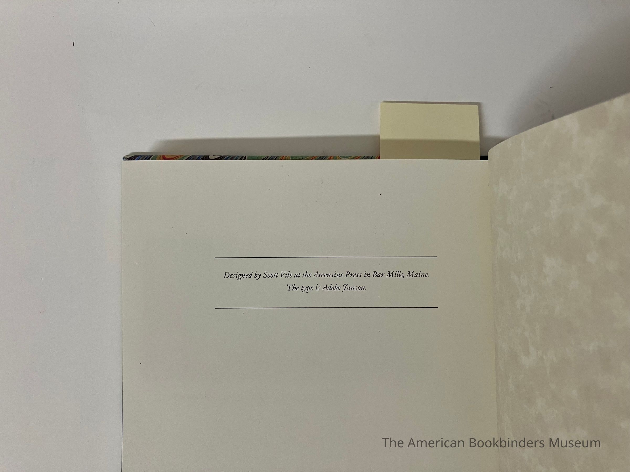 Type is Adobe Janson. Short colophon at the back. Introduced by Wolfe. Designed by Scot Vile at the Ascensius Press in Bar Mills, Maine.