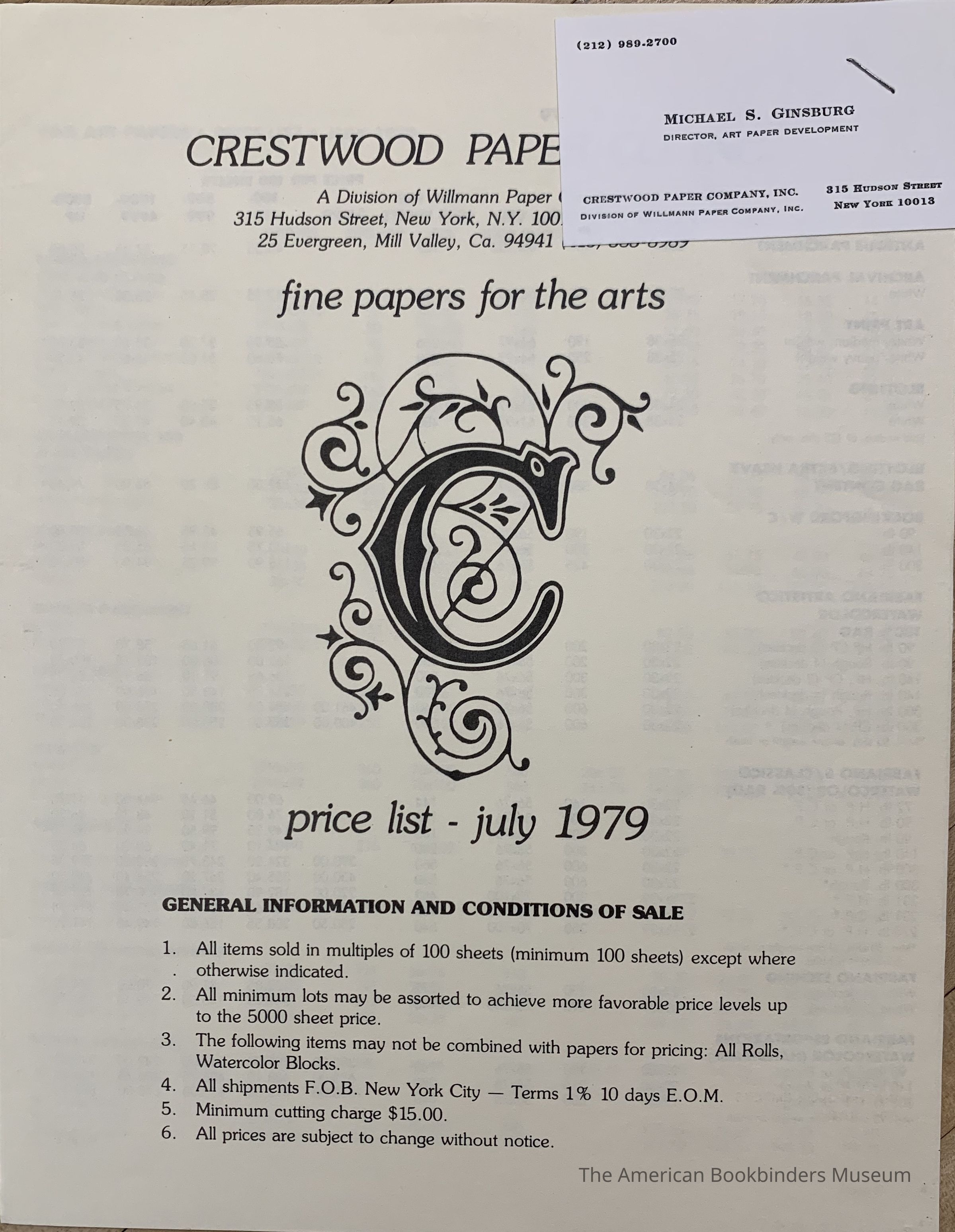 Crestwood Paper Co. Inc. - Fine papers for the arts - Price list July 1979.Entry/Object ID