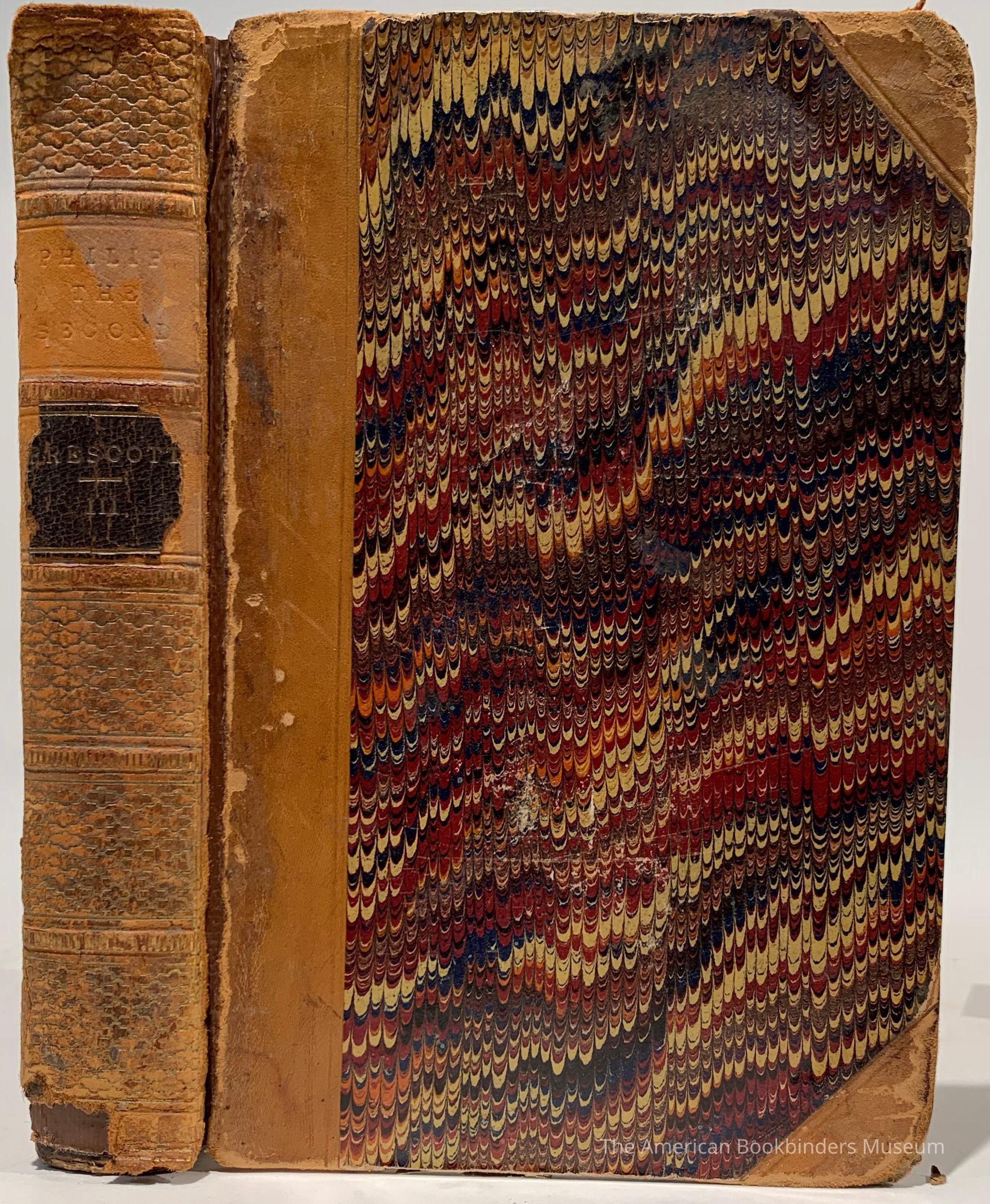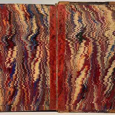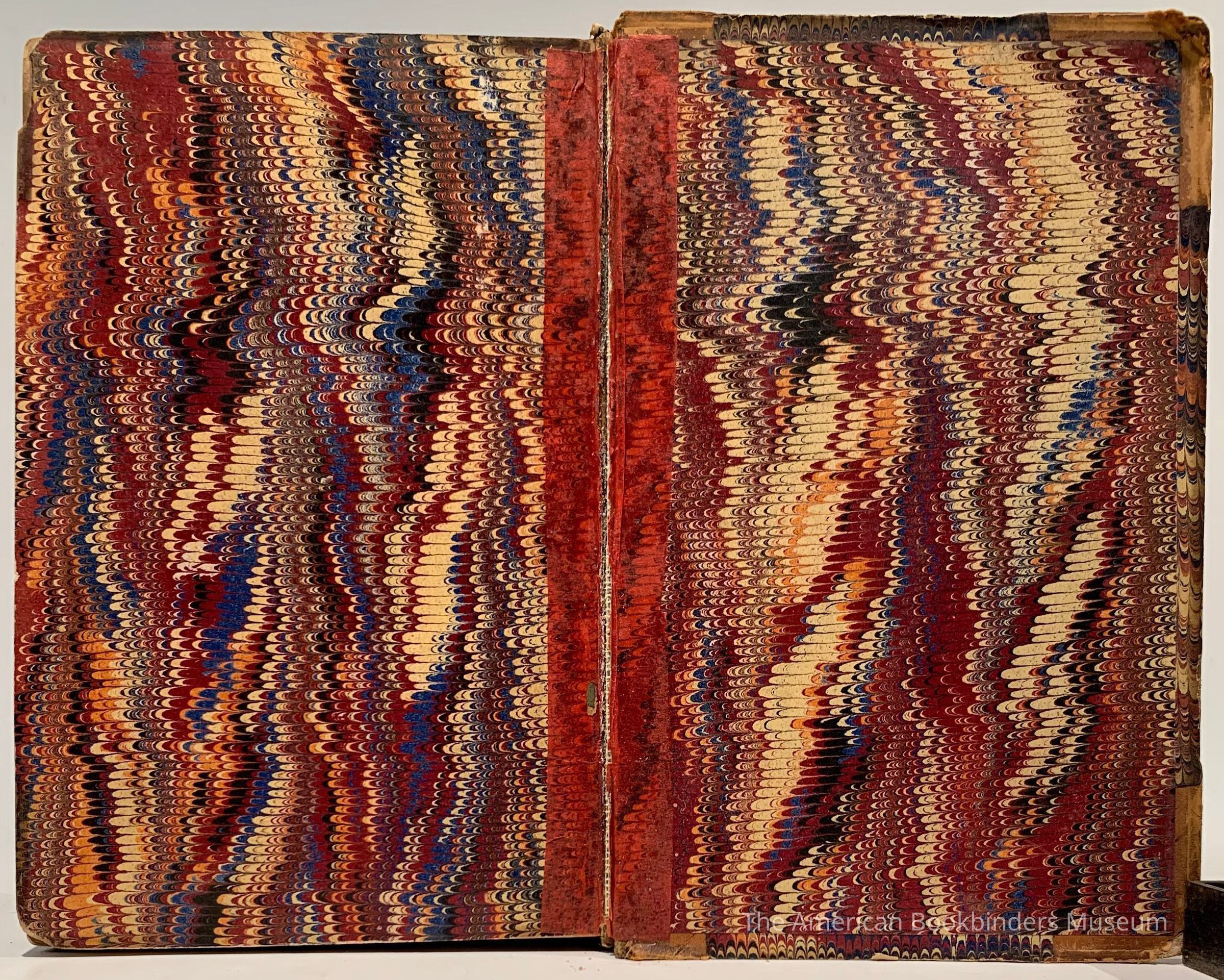 Tan leather, boards covered with marbled paper, gilt title and decoation on spine, marbled endpapers, marbled block edges.
