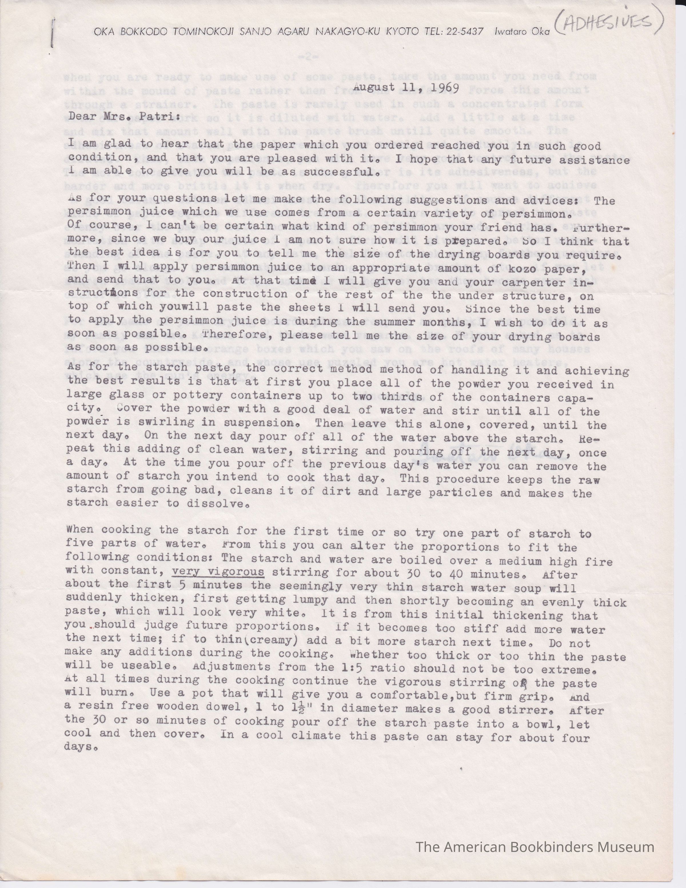 Letter from Oka answering Patri's question on making starch paste and sending a drying boardEntry/Object ID