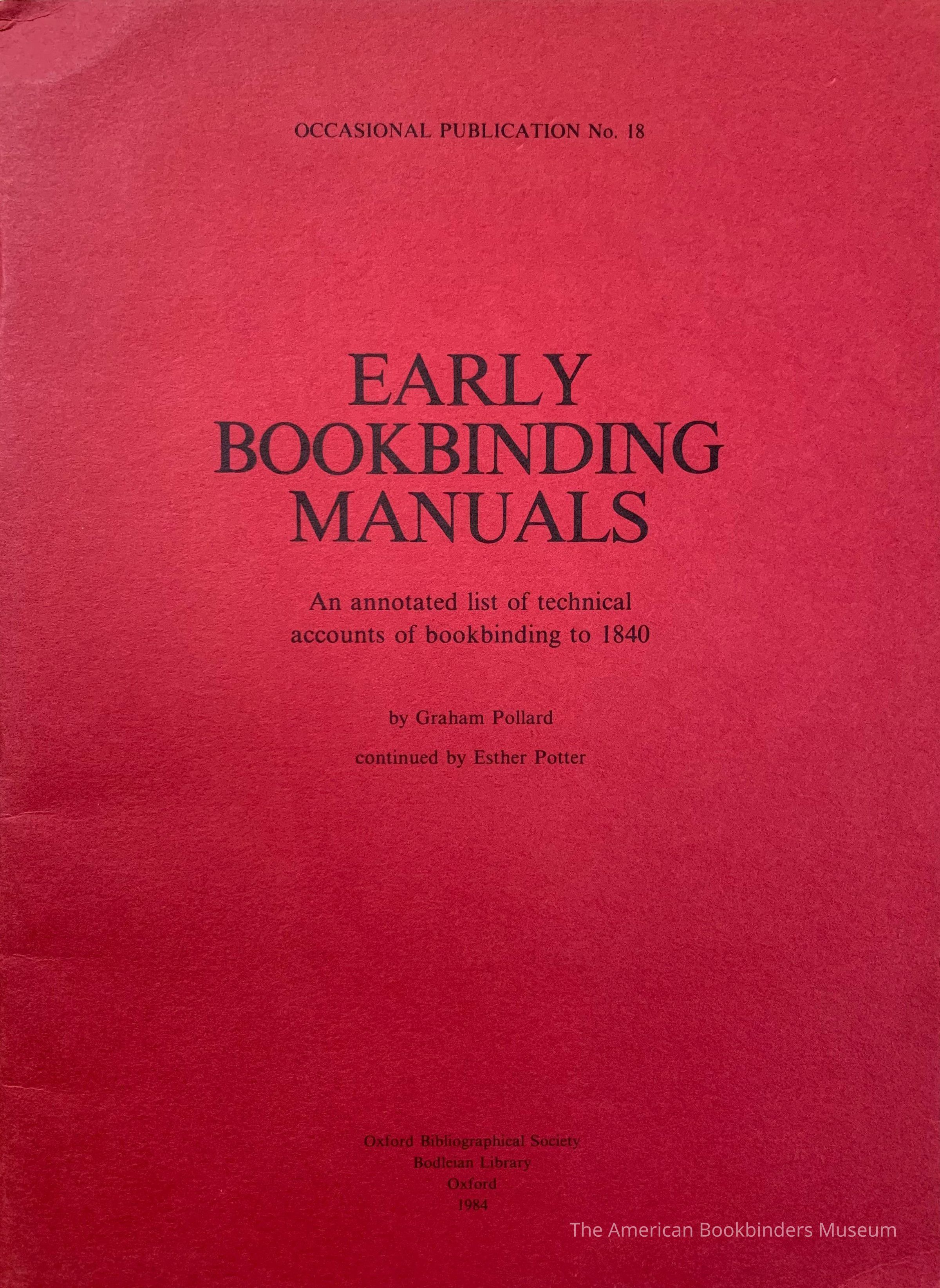 Early bookbinding manuals : an annotated list of technical accounts of bookbinding to 1840 / by Graham Pollard, continued by Esther Potter.