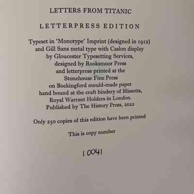 From colophon - typeset in 'Monotype' imprint, Gill Sans metal type with Caslon display by Gloucester Typesetting Services. designed by Rooksmoor Press, letterpress printed at the Stonehouse Fine Press on Bockingford mould-made paper, hand bound at the craft bindery of Blissetts.