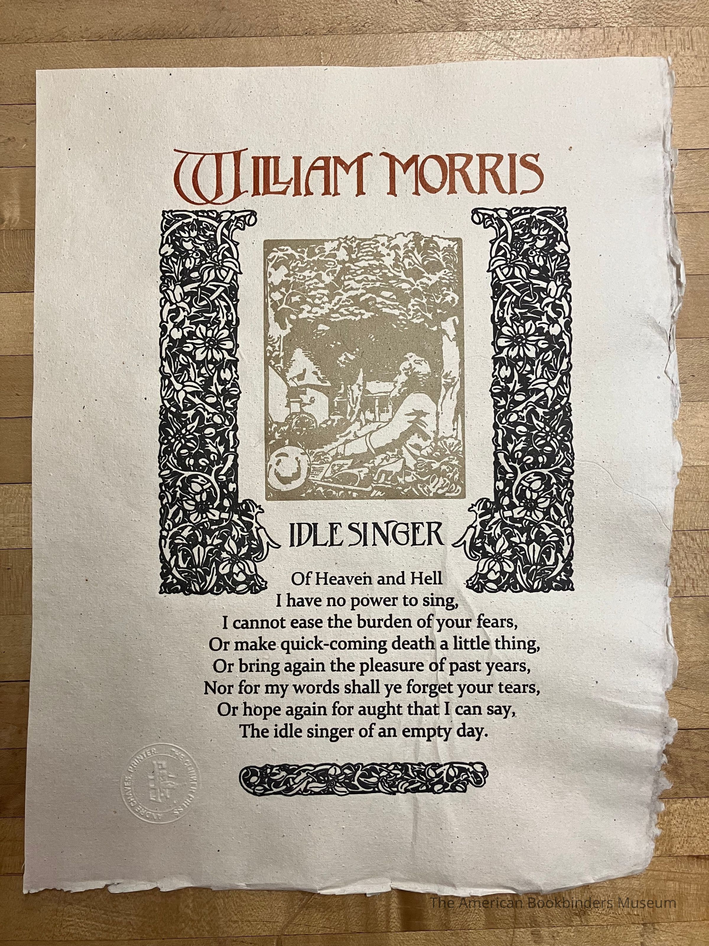 Author at the top in red. Illustration of a man leaning against a tree with buildings in the background, in light brown fills the center. Bracketed on either side with flowers and vines, in black. Title under the the illustration between the brackets. Quote below, again in black, with a line of a similar pattern. Right and bottom are raw edges, with a regular ripple. Paper has brown specks scattered across it.Collection