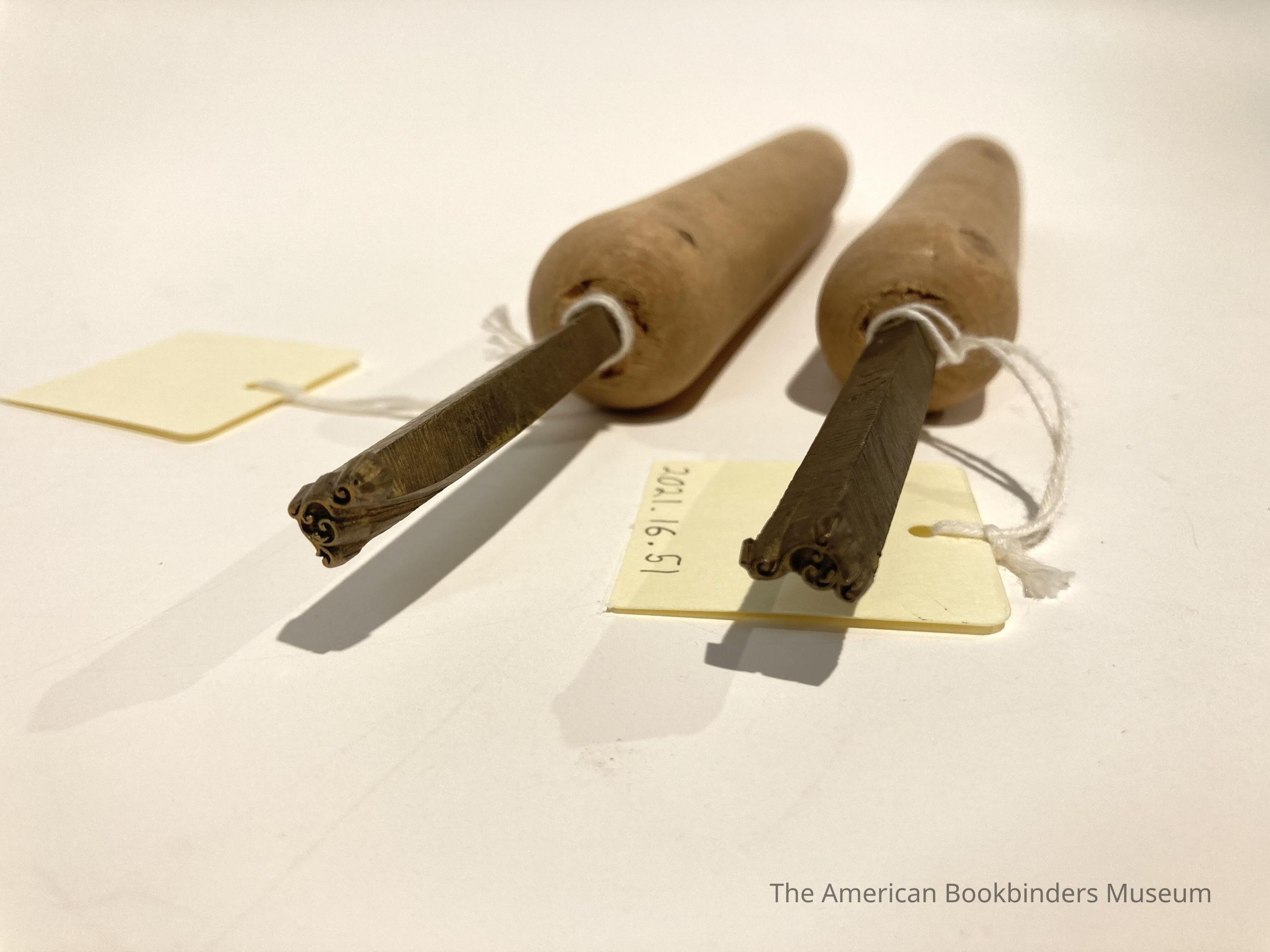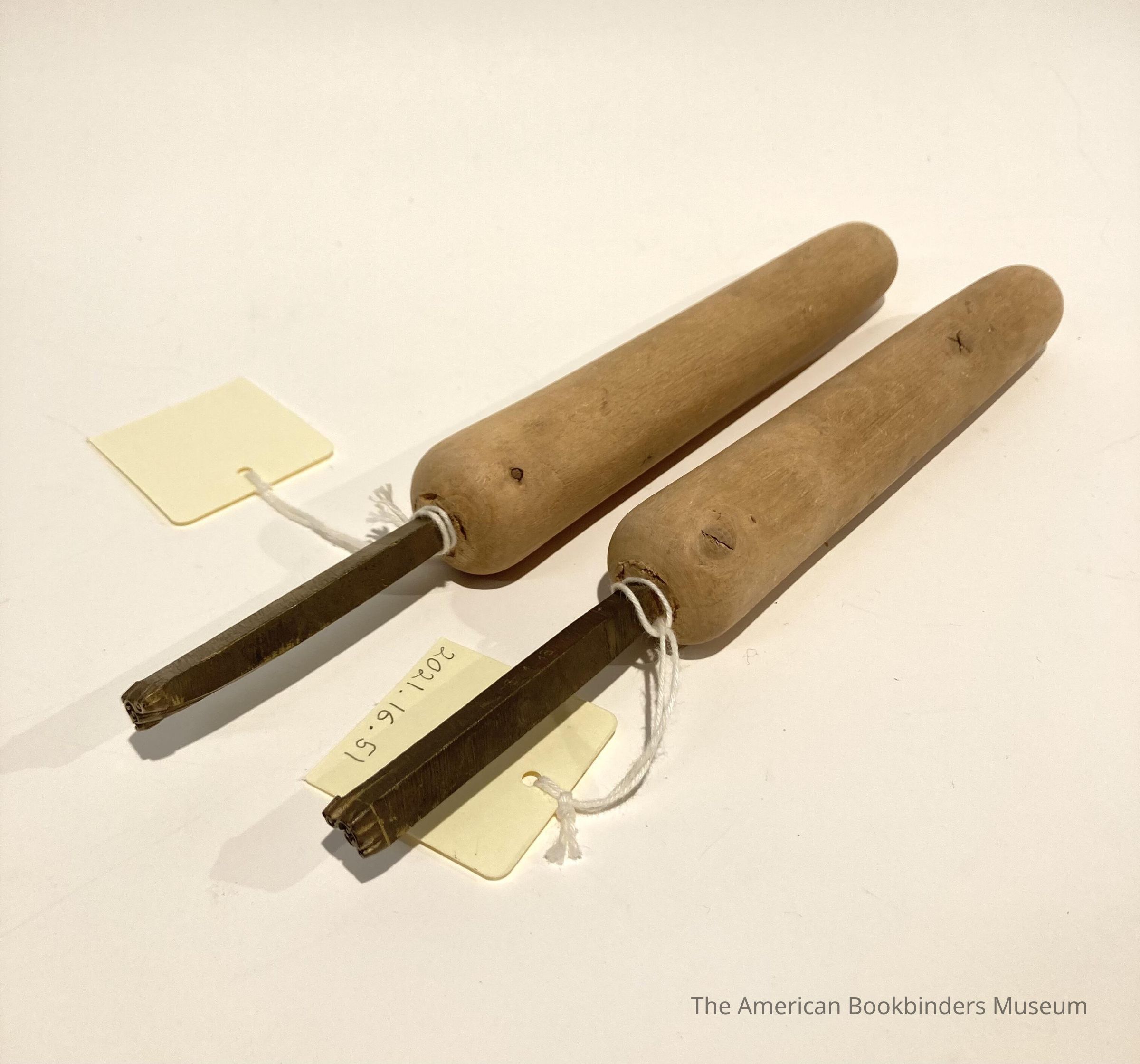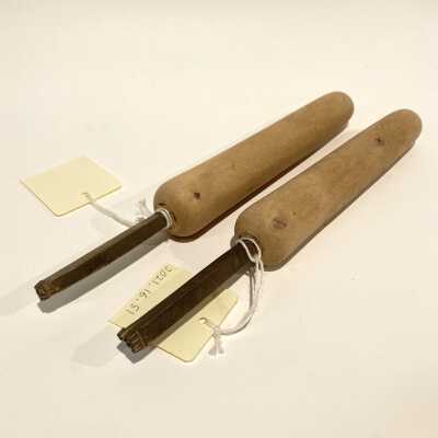 Hand stamps with wood handle. Small, 1cm corner filigree design, resembling curling vine, five branching swirls. 2 identical tools in mirror image.Collection