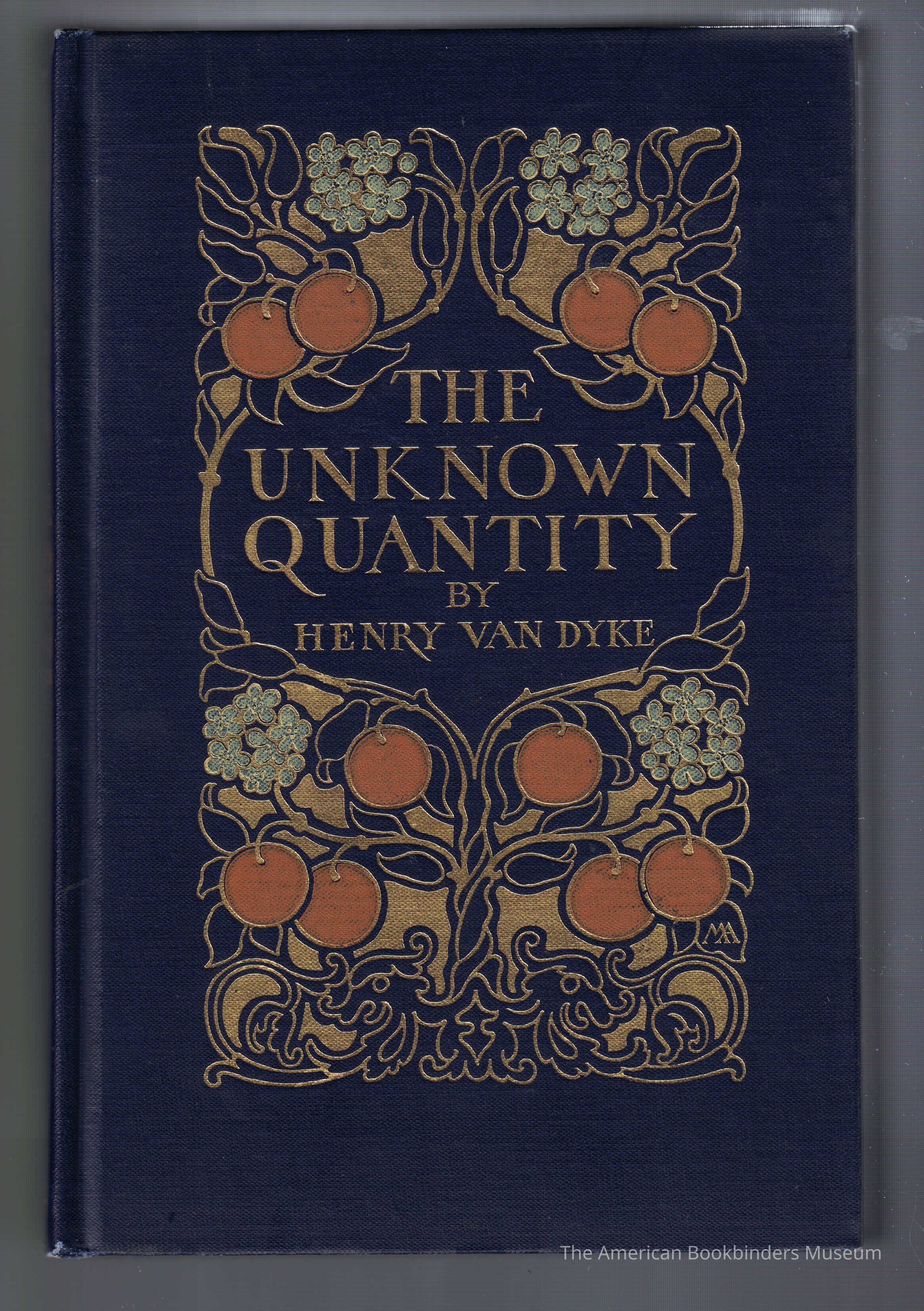 Bound in navy cloth with art nouveau cover design of tree, fruit, and flower in gilt, pale blue, and rust stamping. Gilt title and design to spine. Top edge gilt, untrimmed page edges.