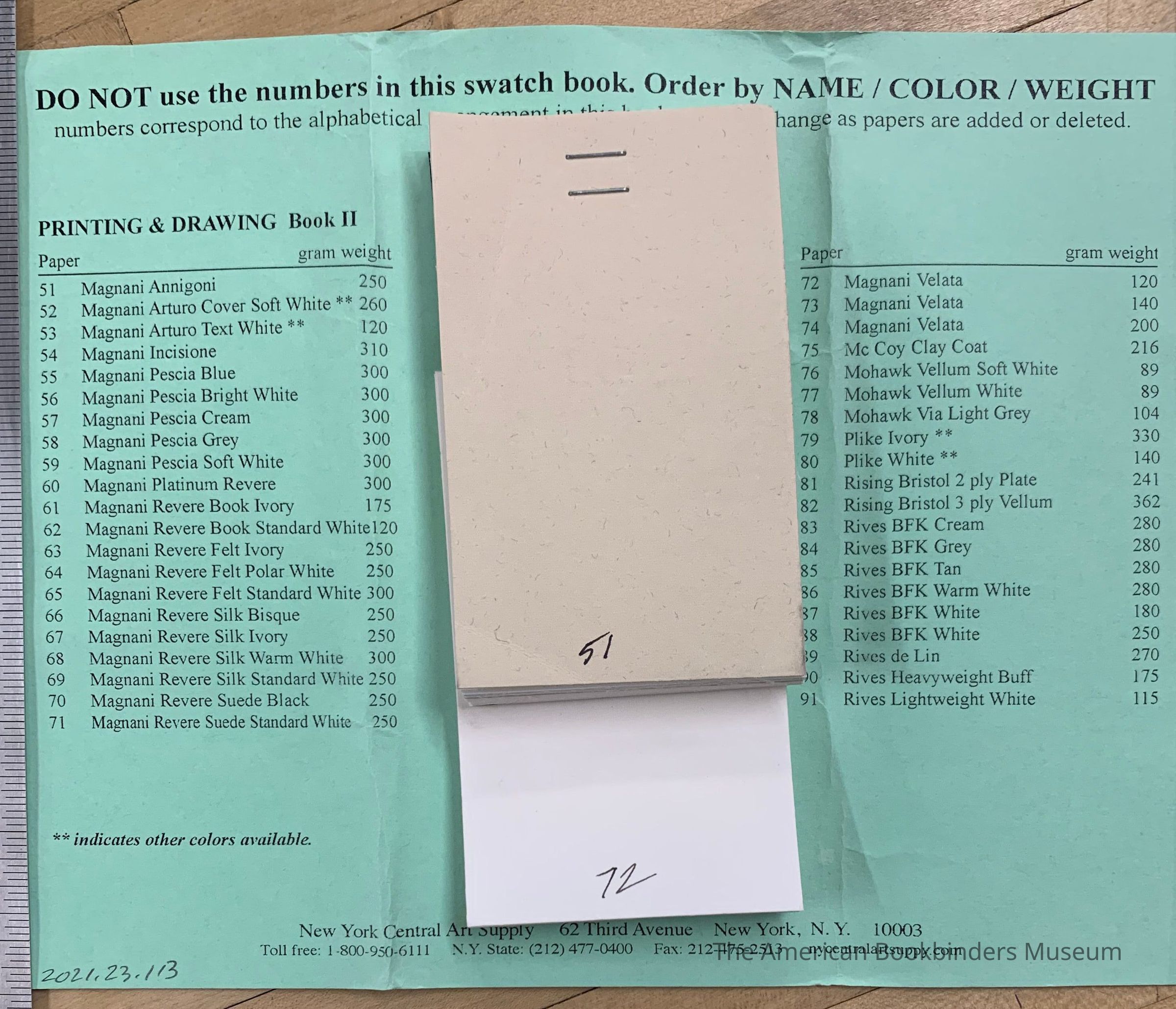 Sample book with two sets of samples, stapled to a light green cover.Collection
