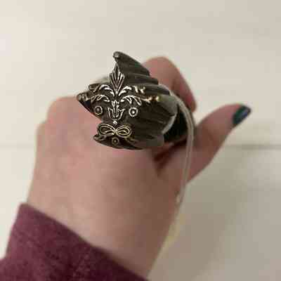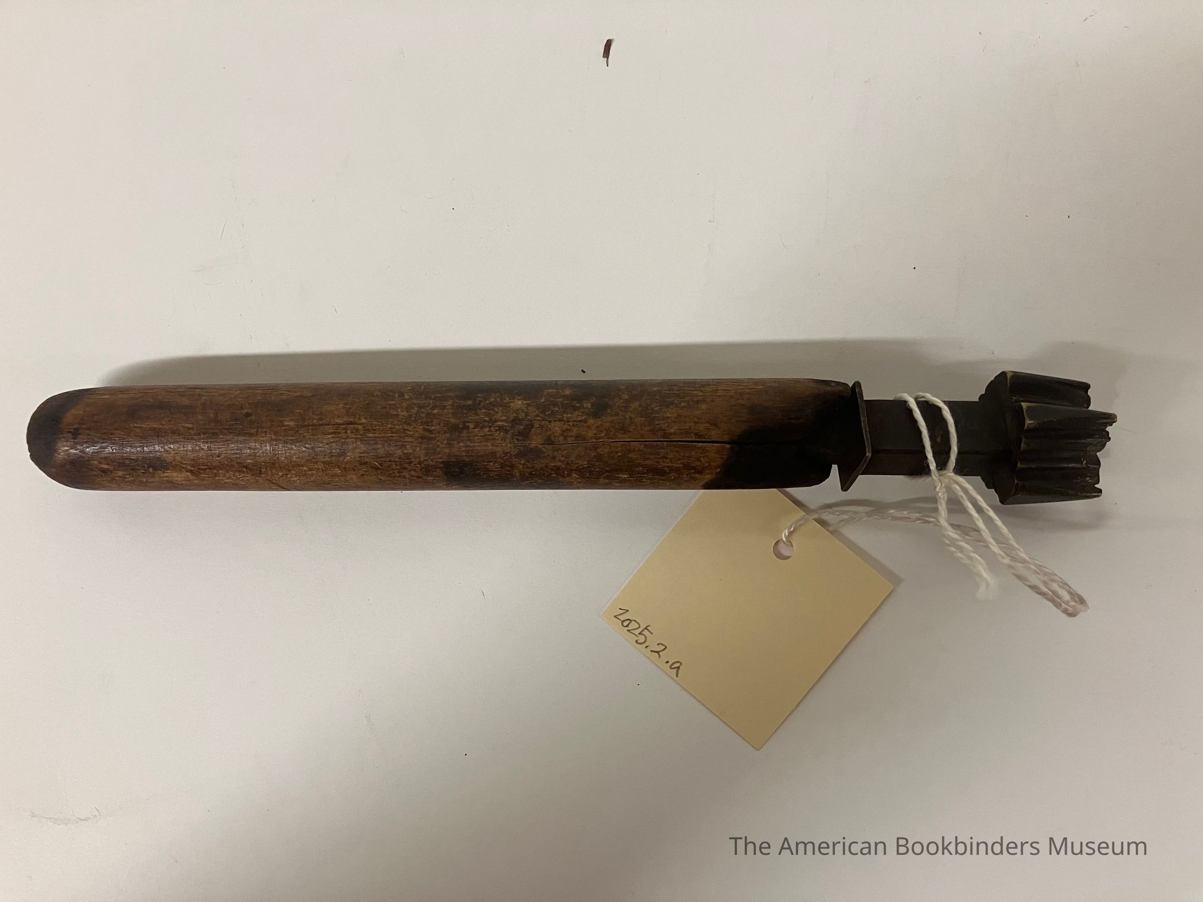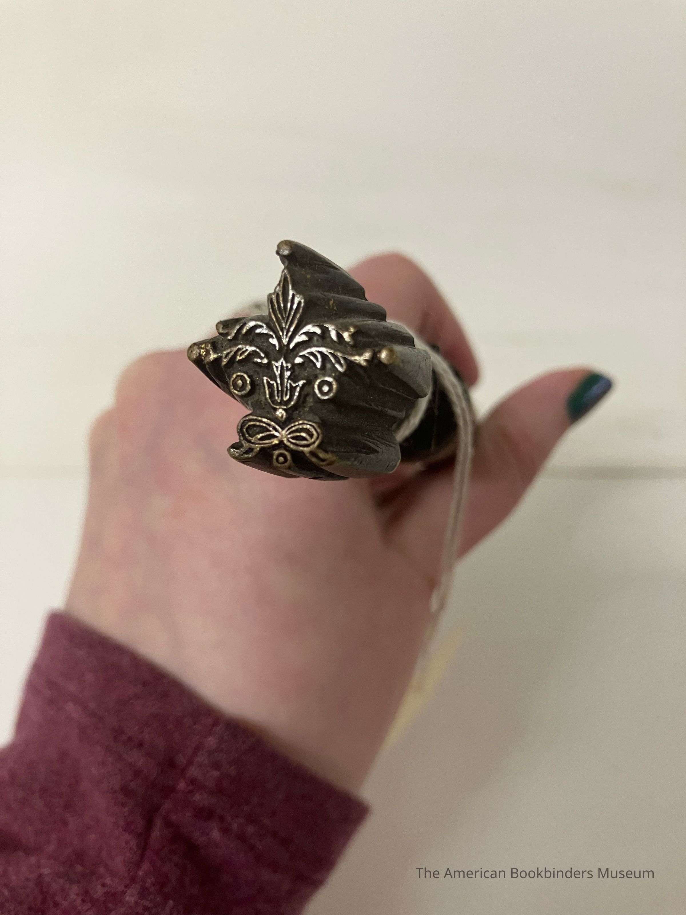 A hand finishing tool with a leafy design, with a knot at the bottom.