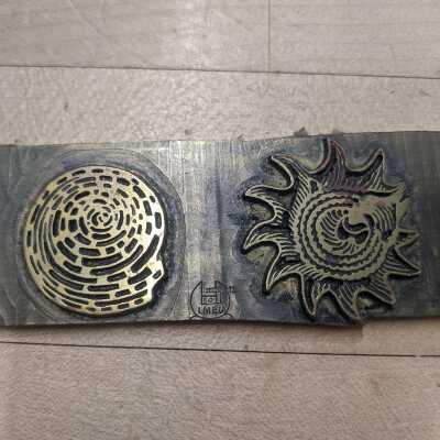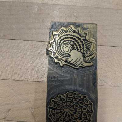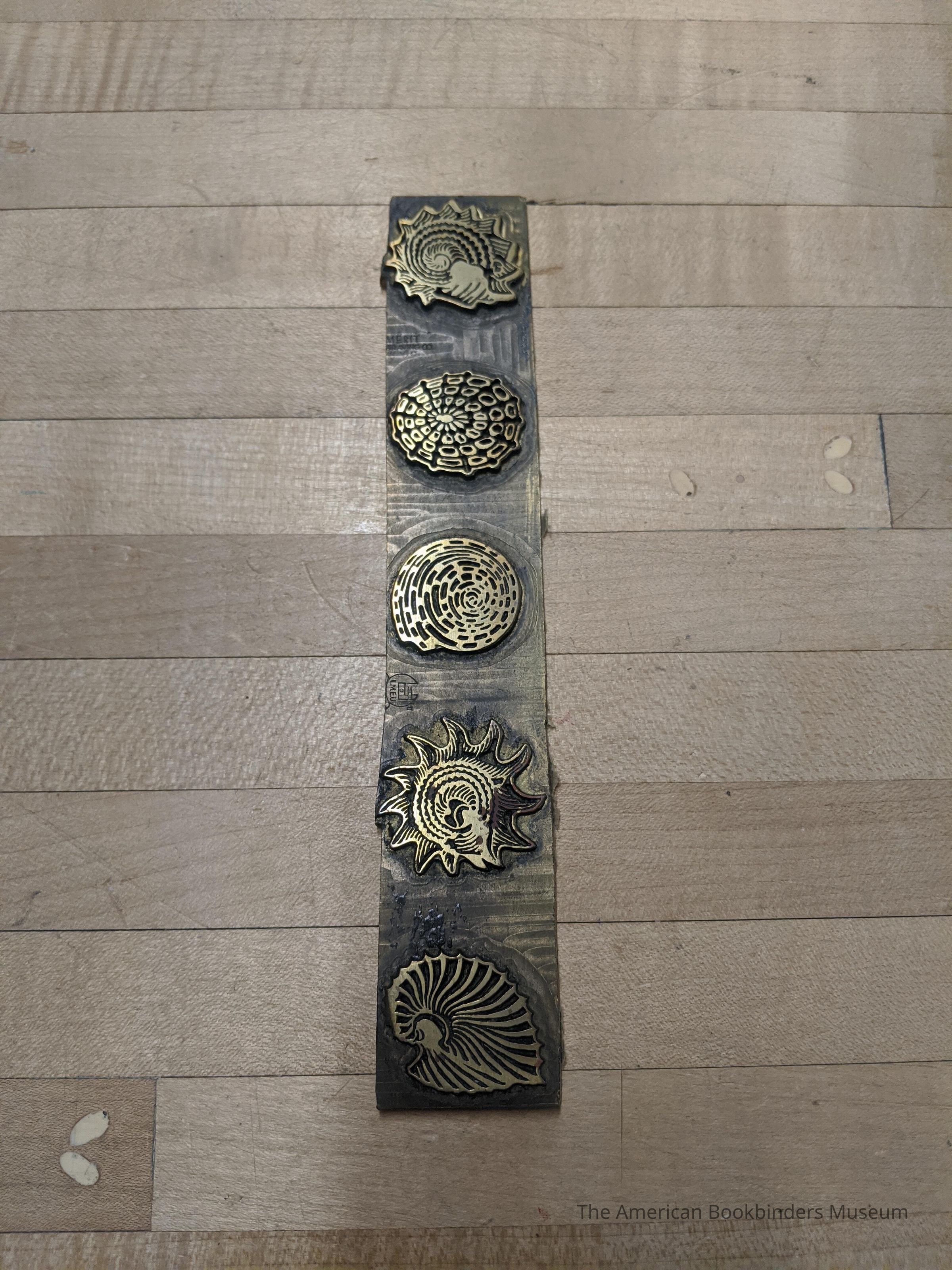 Band die with 5 different sea shells engraved along its length. This die has two small marks engraved on the negative space: "Merit graving co." and a vise with "I.M.E.U" on the base.