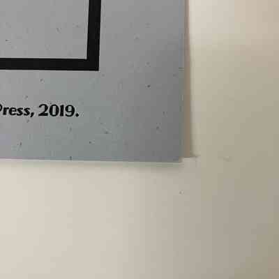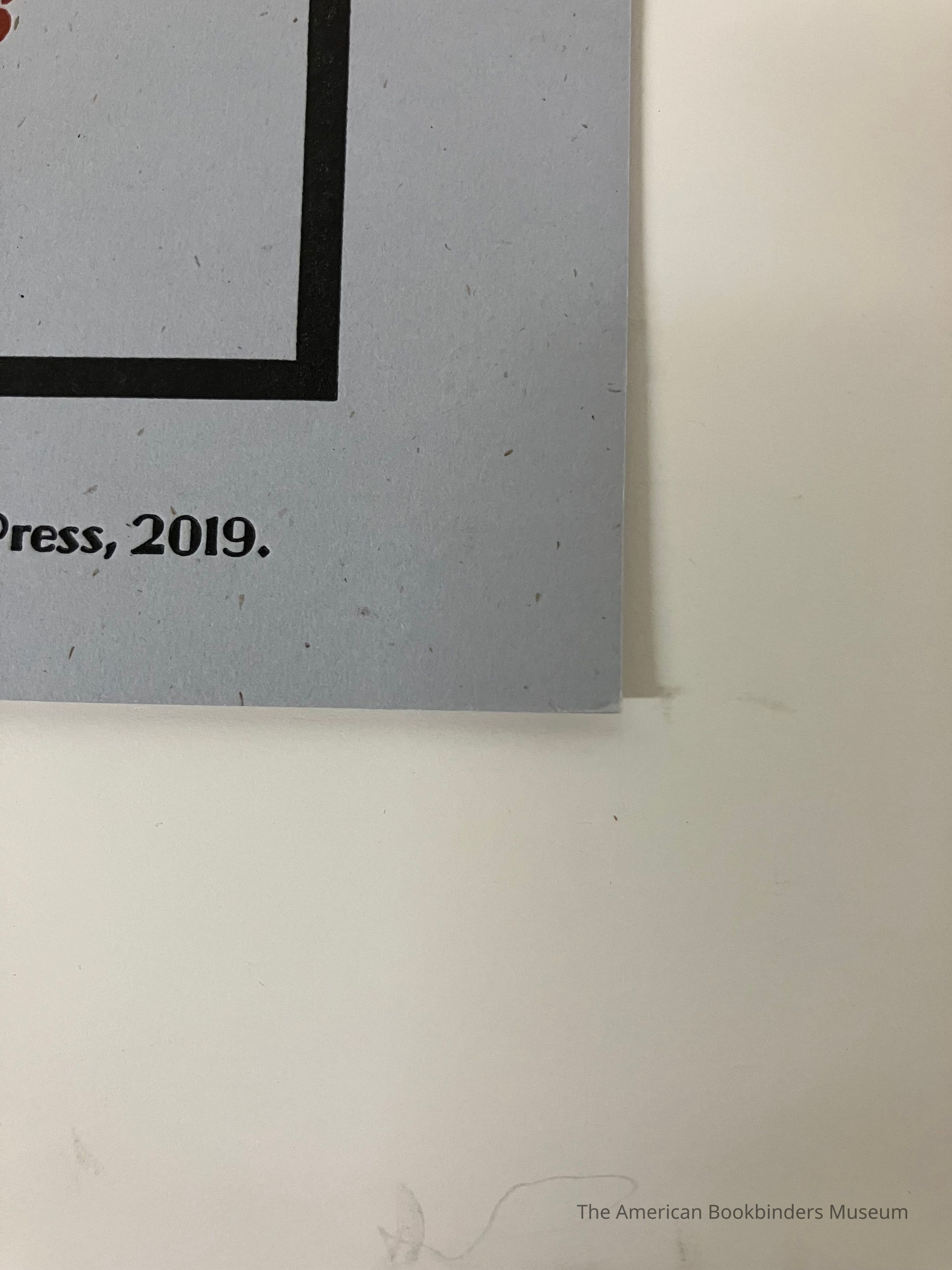 Bleu paper with brown flecks. Illustration of left of Kelmscott Manor. Text on the right, with author below in red. First letter is stylized, with an apple (?) tree.Collection