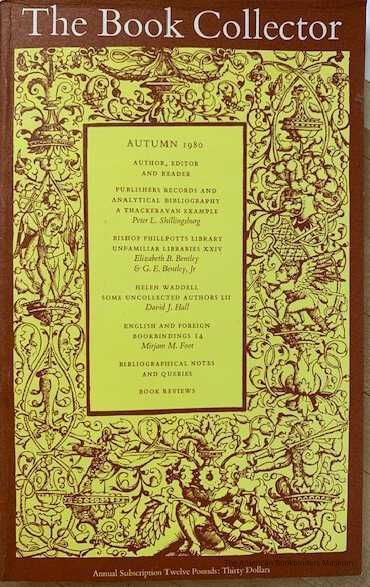 Author, Editor and Reader / Publishers Records and Analytical Bibliography and a Thackerayan Example, Peter L. Shillingsburg / Bishop Phillpotts Library Unfamiliar Libraries XXIV, Elizabeth B. Bentley & G.E. Bentley, Jr / Helen Waddell Some Uncollected Authors LII, David J. Hall / A binding by M.M. Holloway c.1862, Mirjam M. FootCollection
