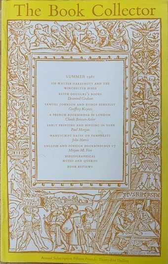 Sir Walter Oakeshott and the Winchester Bible / Keith Douglas's Books, Desmond Graham / Samuel Johnson and Bishop Berkeley, Geoffrey Keynes / A French Bookbinder in London: Auguste Marie de Caumont, Claude Boisset-Astier / Early Printing and Binding in York, Paul Morgan / Manuscript Dates on Pamphlets Collected by Thomas Bowdler II, John Harris / A Binding by Thomas Kruger 1573, Mirjam M. FootCollection